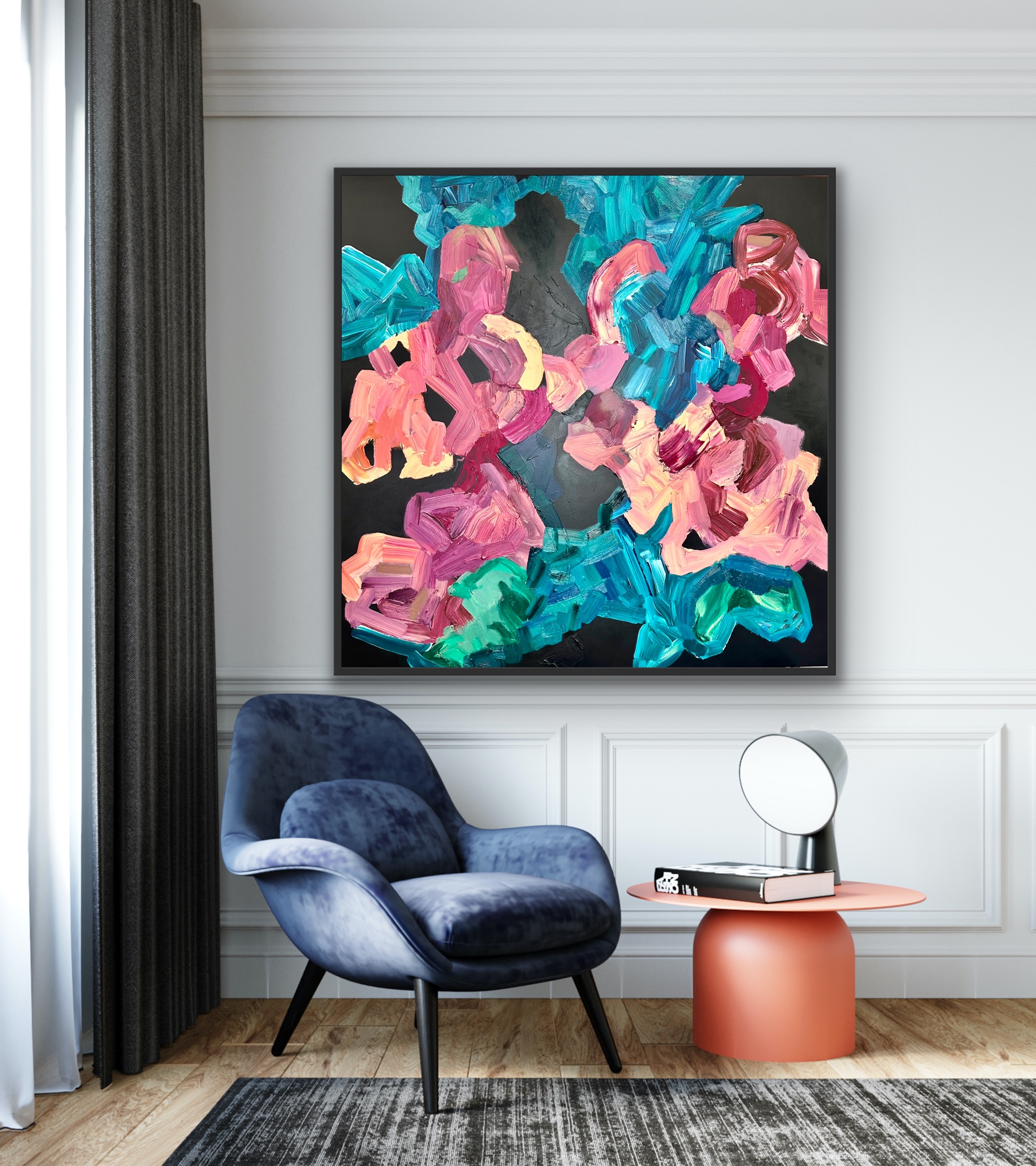 Oil on stretched canvas. 130x130cm FRAMED in a Charcoal ash gallery shadow box frame