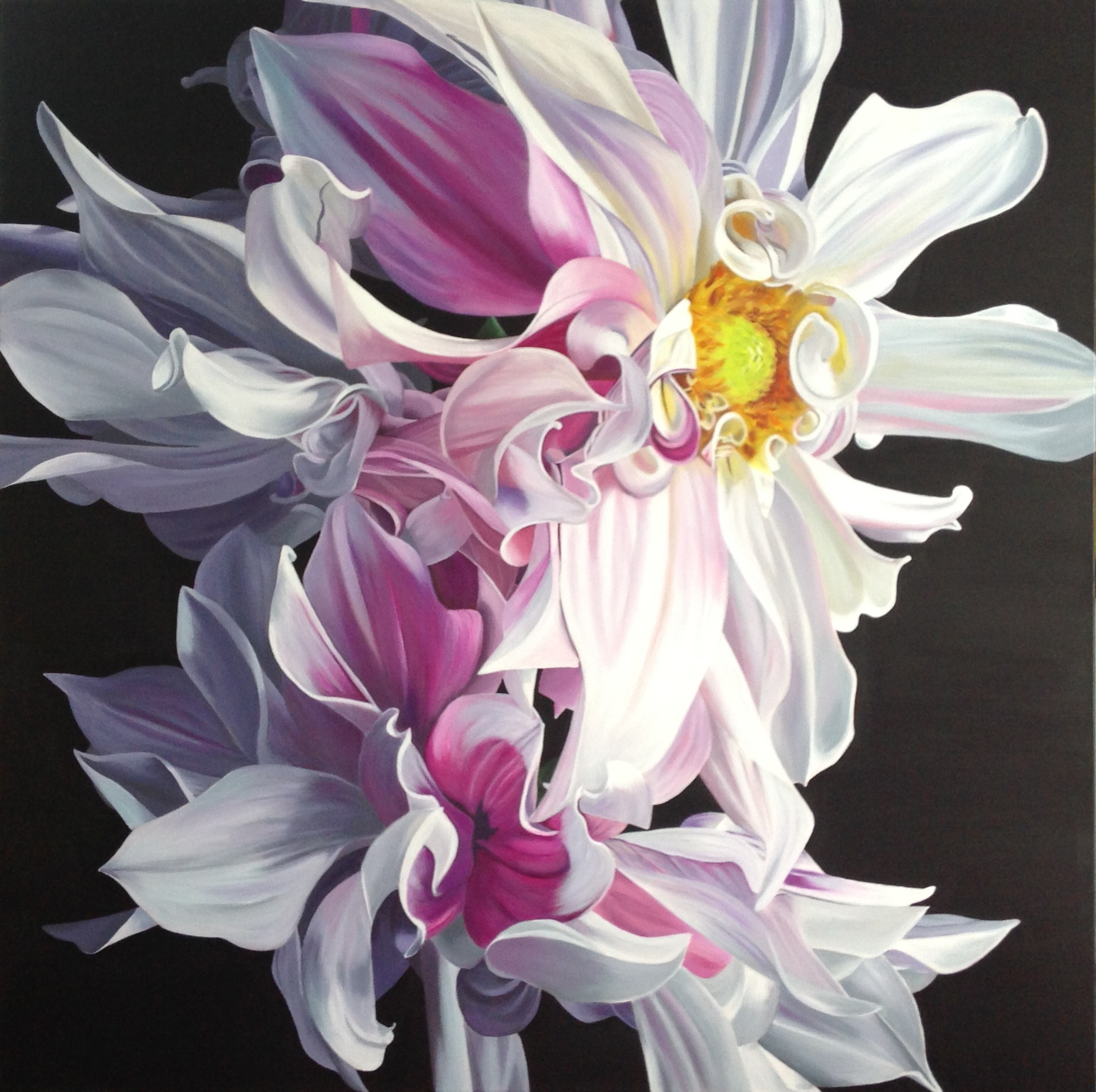 With great sense of movement and fun, this group of beautiful ‘cafe au lait’ dahlias create a spectacular vision. Inspired by my love of all flowers, especially flowers with character and attitude, the play of light on the intricate folds and swirls of this lovely flower draw the viewer in and through the silken petals with sensual pleasure. The inspiration for this painting was a stunning photograph by Loretta @blooming_lovely_tamborinemount who kindly allowed it’s use.