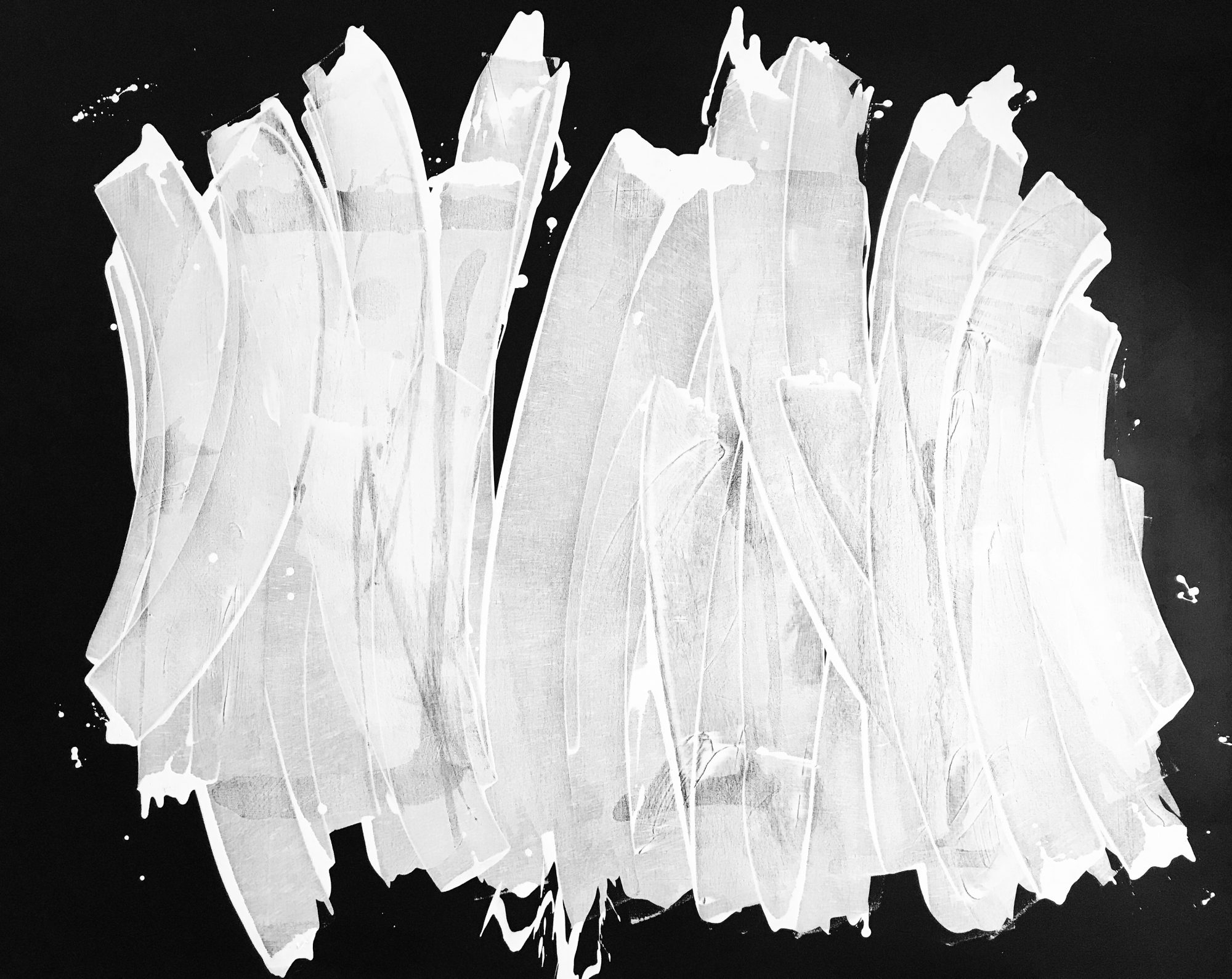 Created with white flow acrylic on a stark black background it is a statement piece that will add drama to any interior space.