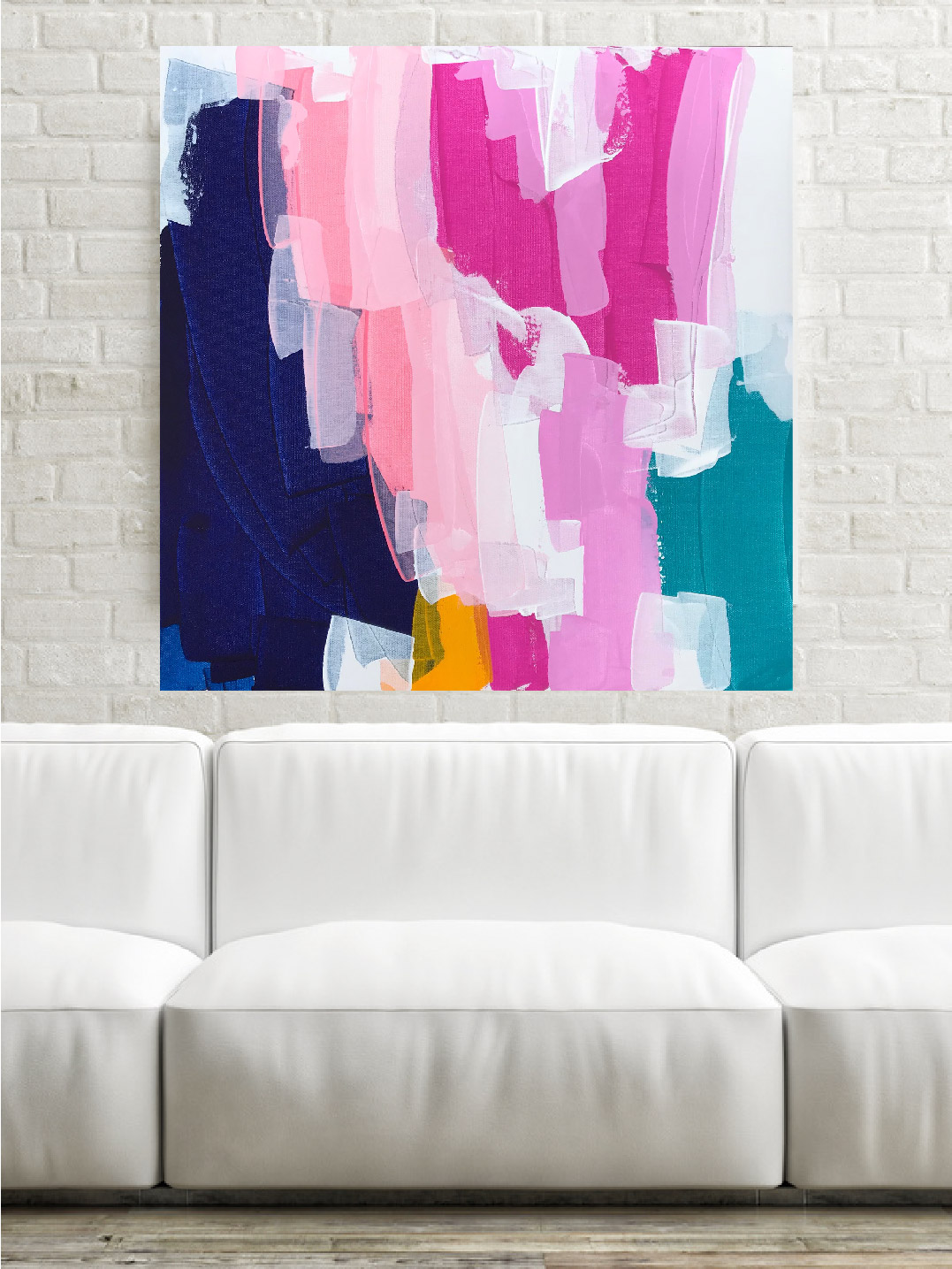 Artwork colours are bright & bold with a touch of softness added with pale peach & white.