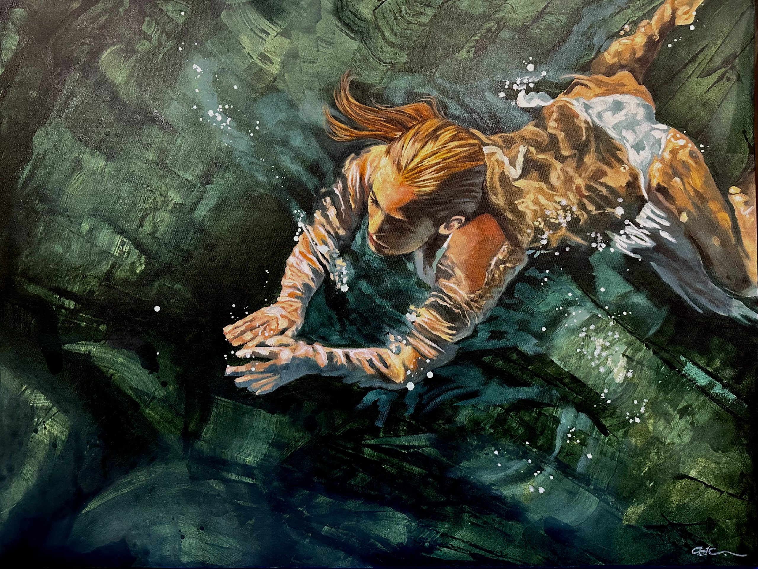 Dancing Shadows by Amanda Cameron – is one of a new series called ‘Salt Water’. While still exploring the interaction and connection between water, light and form, this series also analyses the sense of disquiet when swimming in deep ocean water. At the same time, the main focus is the quest for refuge, quietness and escapism. These paintings juxtapose the lone swimmer and a few minutes of introspection when alone in deep water against the fear of the unknown. The constant struggle between hyper-realism and having a painterly quality to my work is a conflict that I am always trying to balance; therefore, thick paint and evident brush strokes are present when viewed up close. This piece is painted in professional oil paints on a museum-quality canvas and finished with edges painted and varnish for protection. It comes framed in a Natural Wood floating box frame, is ready to hang and includes a certificate of authenticity.