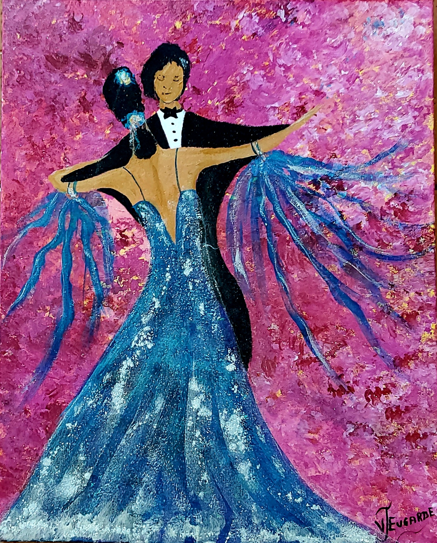 This painting has layers of acrylic paint and her dress is full of pearlized texture