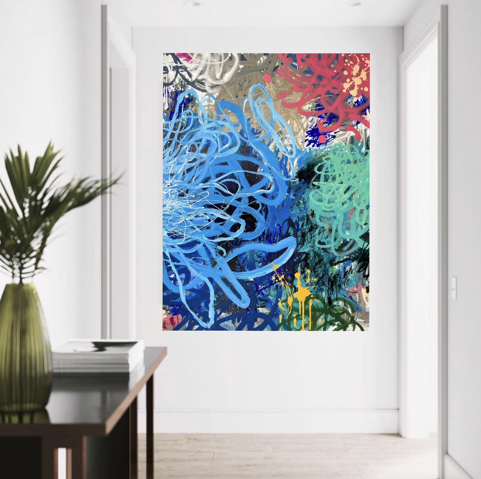The artwork is a Large Statement piece and will give maximum impact to any room. My art is directly influenced by Graffiti in City Laneways, Vintage Billboards and other weathered surfaces. This piece is also inspired by my love of gestural abstraction and my obsession with using spray paint.