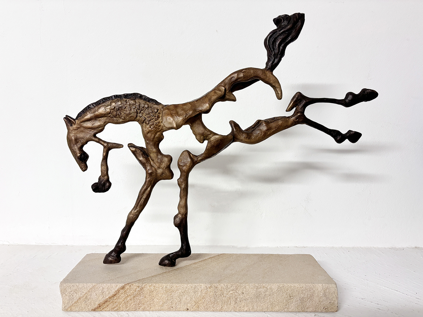 Danny Boy- by Helena Lillywhite – Â I grew up on a riding school, deeply connected to horses, creatures of power, freedom, and spirit. My Horse Series sculptures are not literal forms but evocations of movement and essence. Fragmented bronze, shifting light, and rough stone bases express their primal energy. Each piece is named after a real horse from my childhood, making the series both tribute and memory, a bridge between past and present, body and spirit.