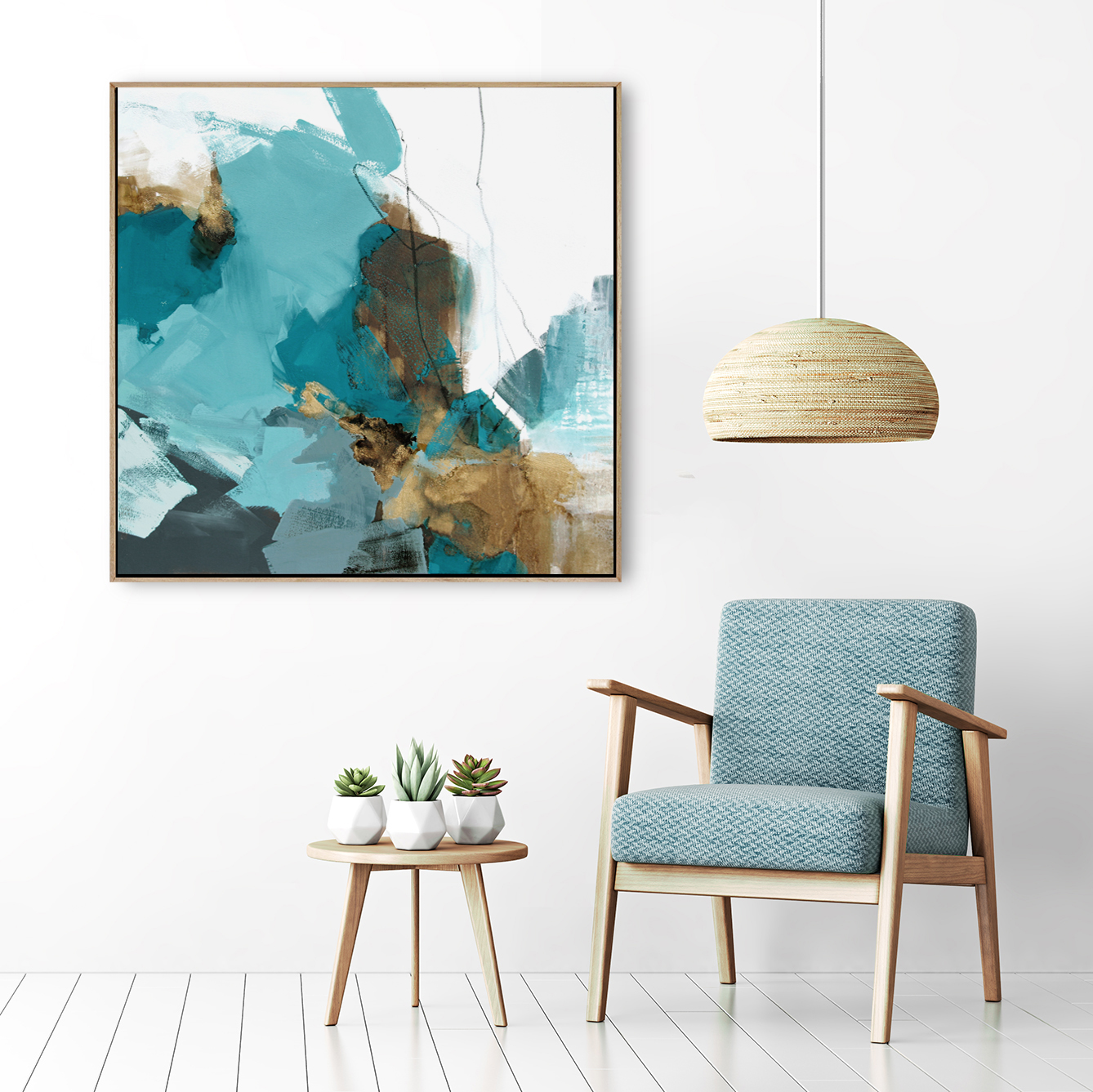 Dante is very textured and is a combination of teals, greys, browns and gold. The painting extends around the 3.8cm sides of the canvas so it’s ready to hang. An oak floating frame (as in room images) can be included for an additional $320.
