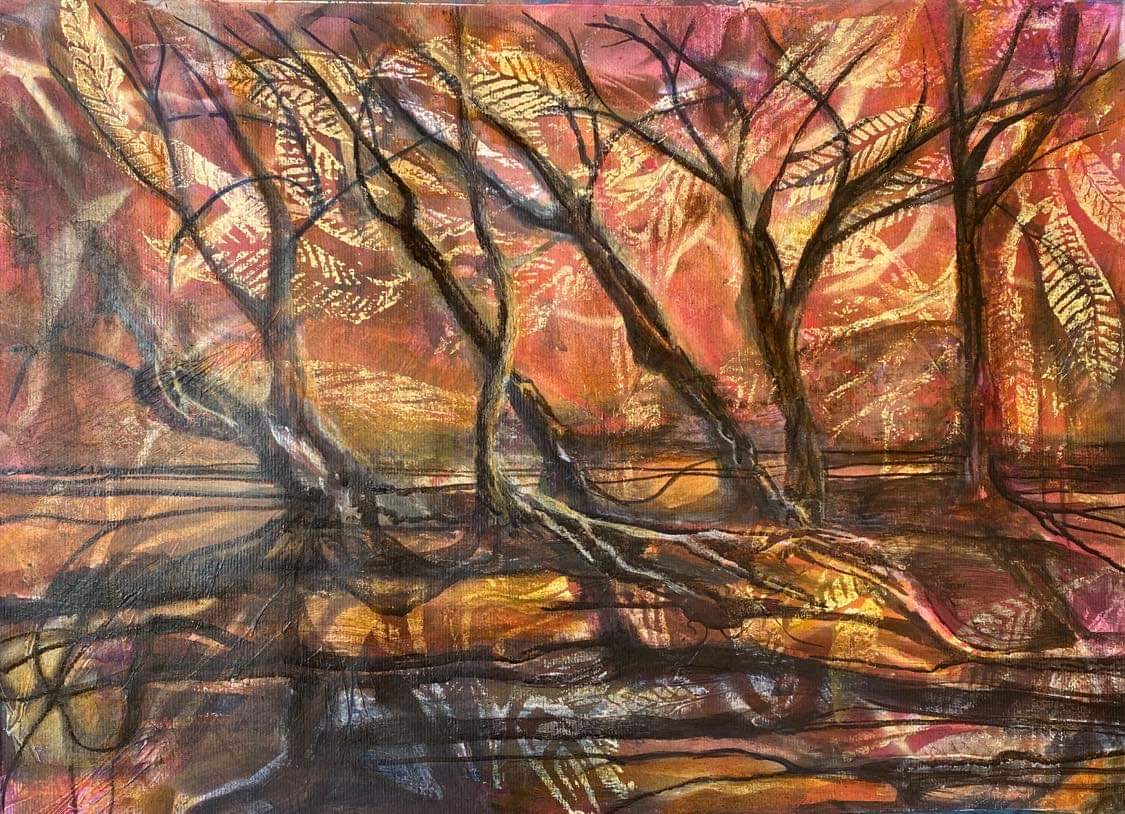 ‘Dappled Ligh’t by Rosemary Legat –Â Acrylic paint, spray paint, acrylic and printing ink on 300gsm mixed media paper (requires framing).