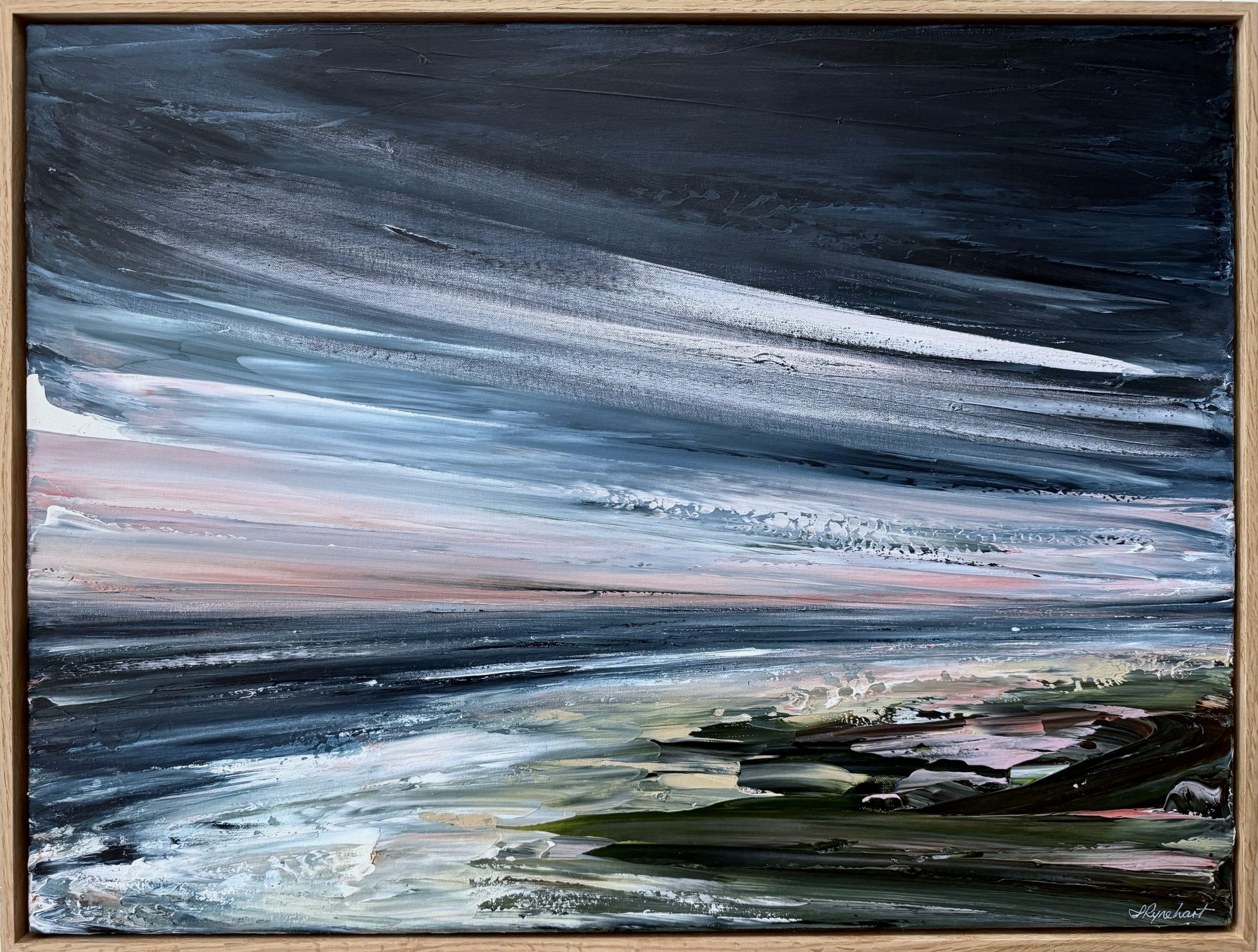 Created with palette knives on 12 oz stretched cotton canvas, this emotive and expressive beachscape evokes pause and reflection.