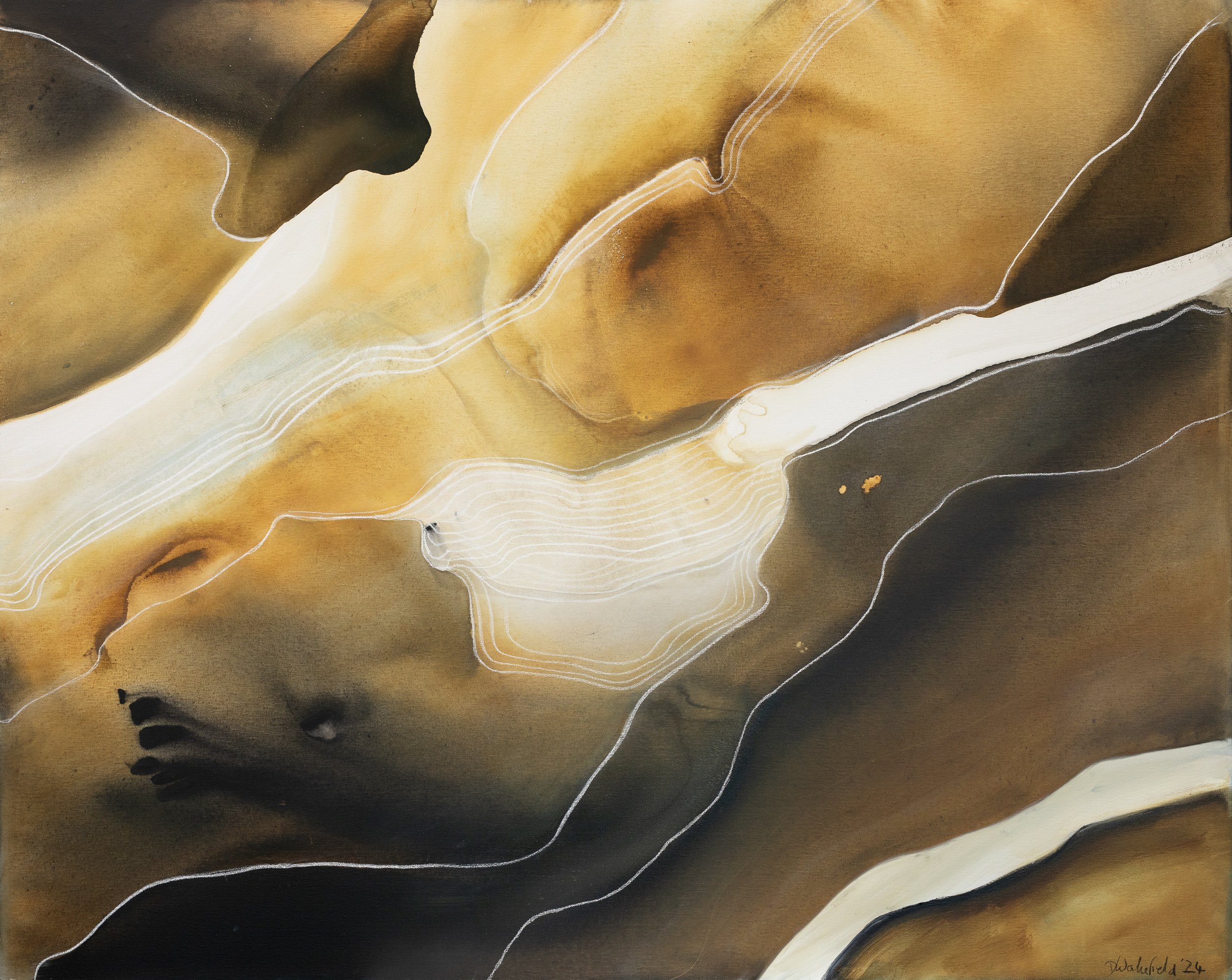 Dark Sands by Dinah Wakefield is inspired by the light, the colours and the natural beauty of the Noosa region of Australia. “What I love most about Noosa is the interplay of light. From the oceans to the clouds, to the river estuaries and the hinterland, this canvas unfolds before me every day and finds expression in my paintings”.
