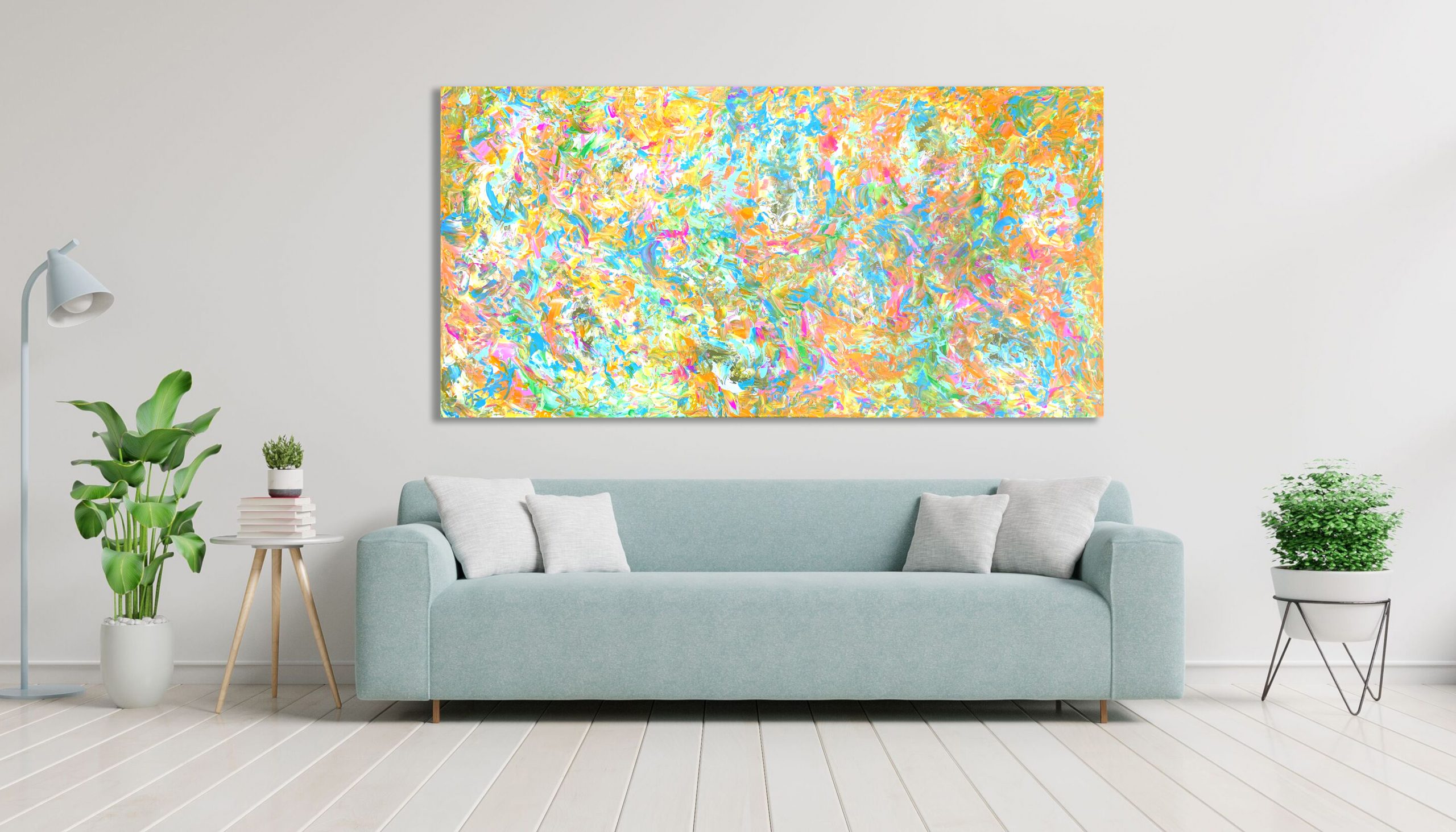 This work is painted on professional-grade canvas and has been sealed with varnish. The canvas has the dimensions 91.4 cm height x 182.9 cm width.