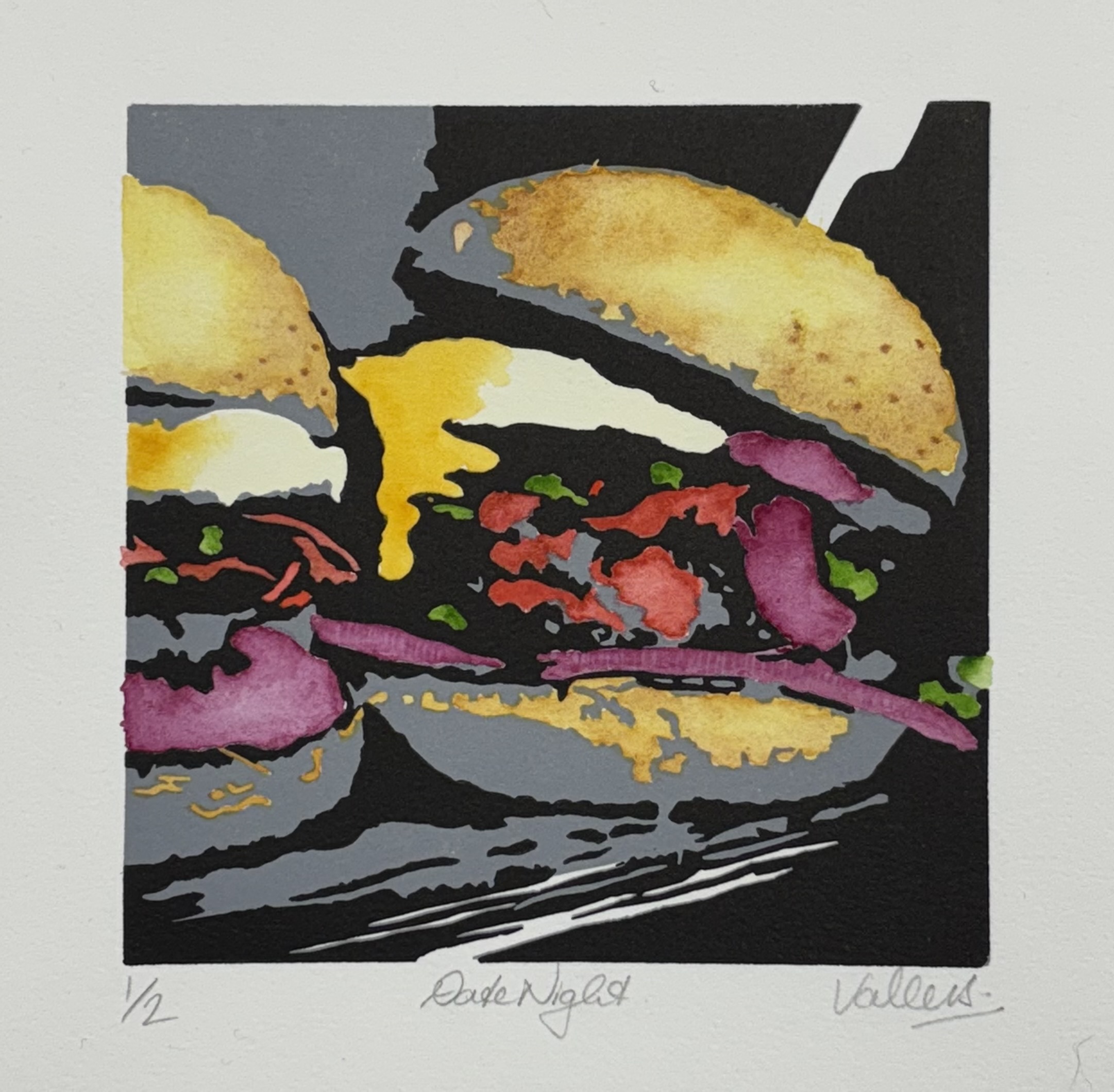 Date Night by Sara Valentino – This Lino print with watercolour highlights by Sara Valentino is a very limited edition of only 2 prints.