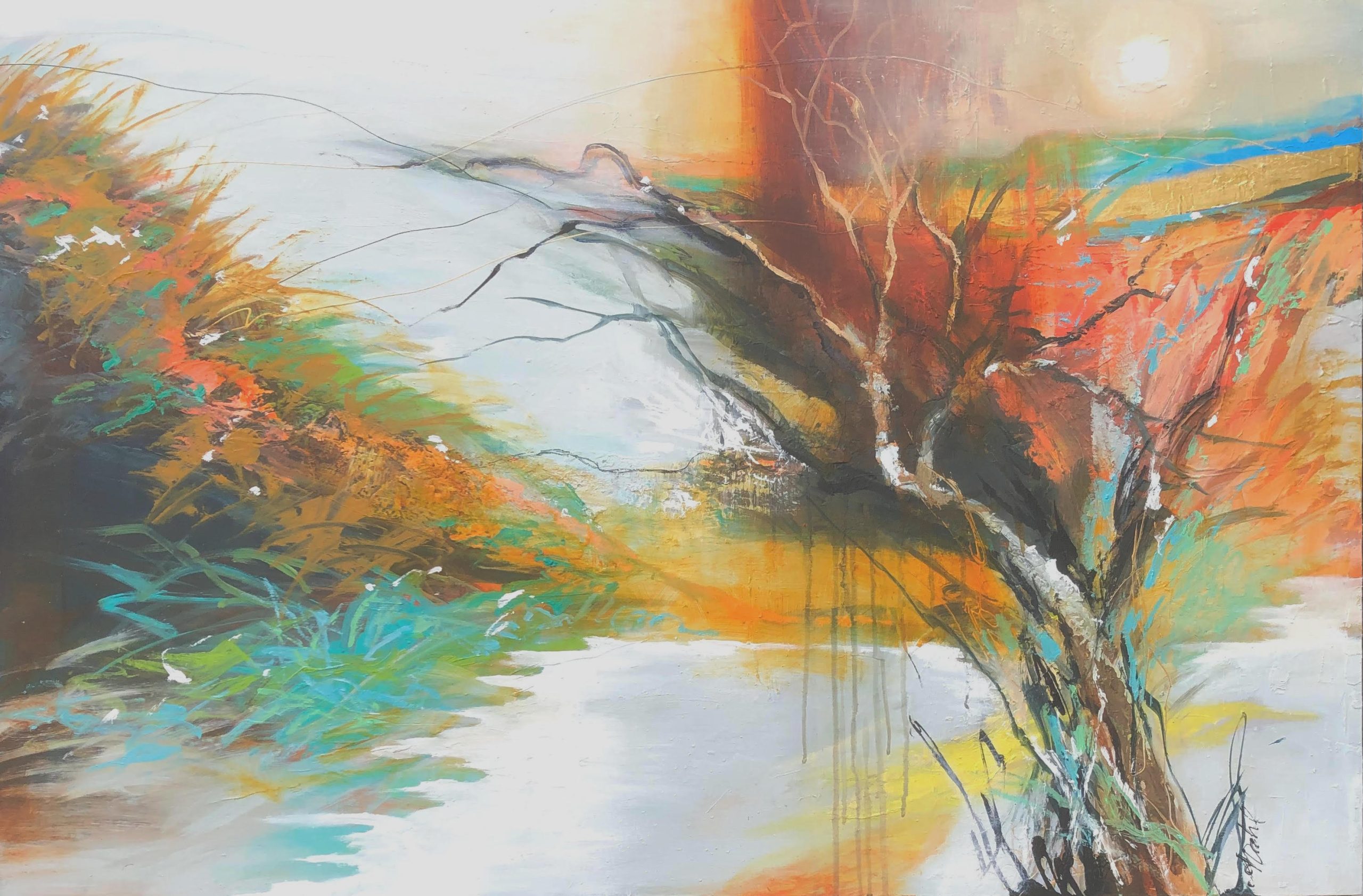 This painting is on good quality canvas and a wooden support stretcher frame. It has mixed media with- texture gel, glue, acrylic inks, acrylic paints and oil. Then it is varnished with artist quality varnish.