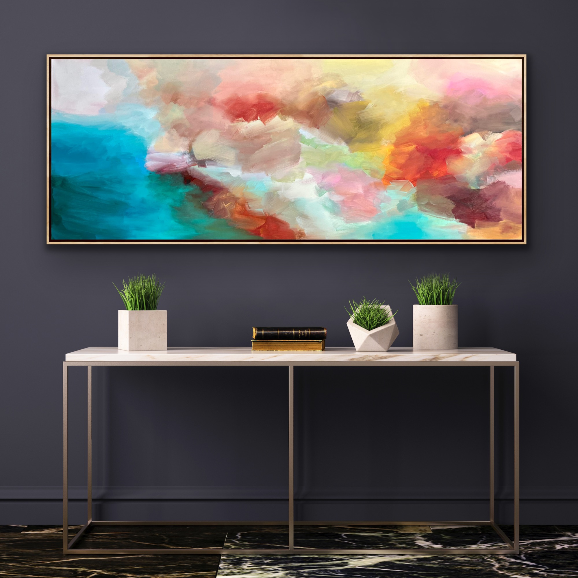 Daybreak by Theo Papathomas – a painting celebrating colour and light. A very soothing and tranquil painting where sky, clouds, water come together to create this beautiful harmonious landscape. Capturing the beautiful warm and cool colours of the landscape against the light colours of the sky. Clouds covering the hills.Painted in a very expressionistic way with acrylic paints . I tried to create so much depth in the painting .A very harmonious composition of colours and forms that makes it a very poetic and romantic painting . The painting does not come with the external frame.The painting is signed and dated 2022 at the back and comes with a certificate of Authenticity.