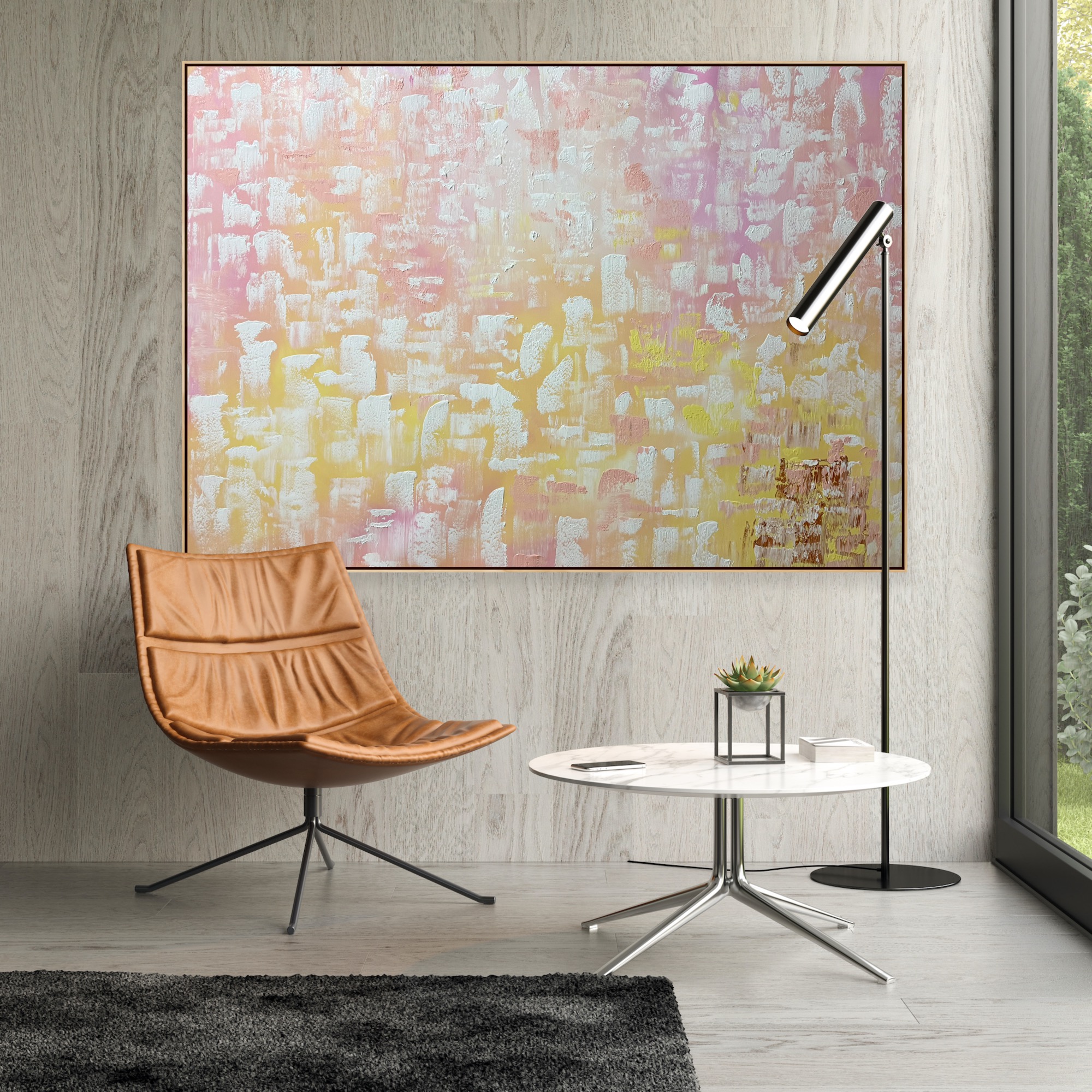 Daydream Dip, by Alanah Jarvis, is a playful splash into the lighter side of life. Awash with soft sherbet pinks, golden lemonade hues and creamy textures, this abstract painting feels like dipping into a summer daydream; carefree, bright and full of joy. The layered brushwork creates a sense of movement and rhythm, like laughter carried on a warm breeze. It’s an invitation to let go, smile wide, and bask in the sweetness of the present moment.