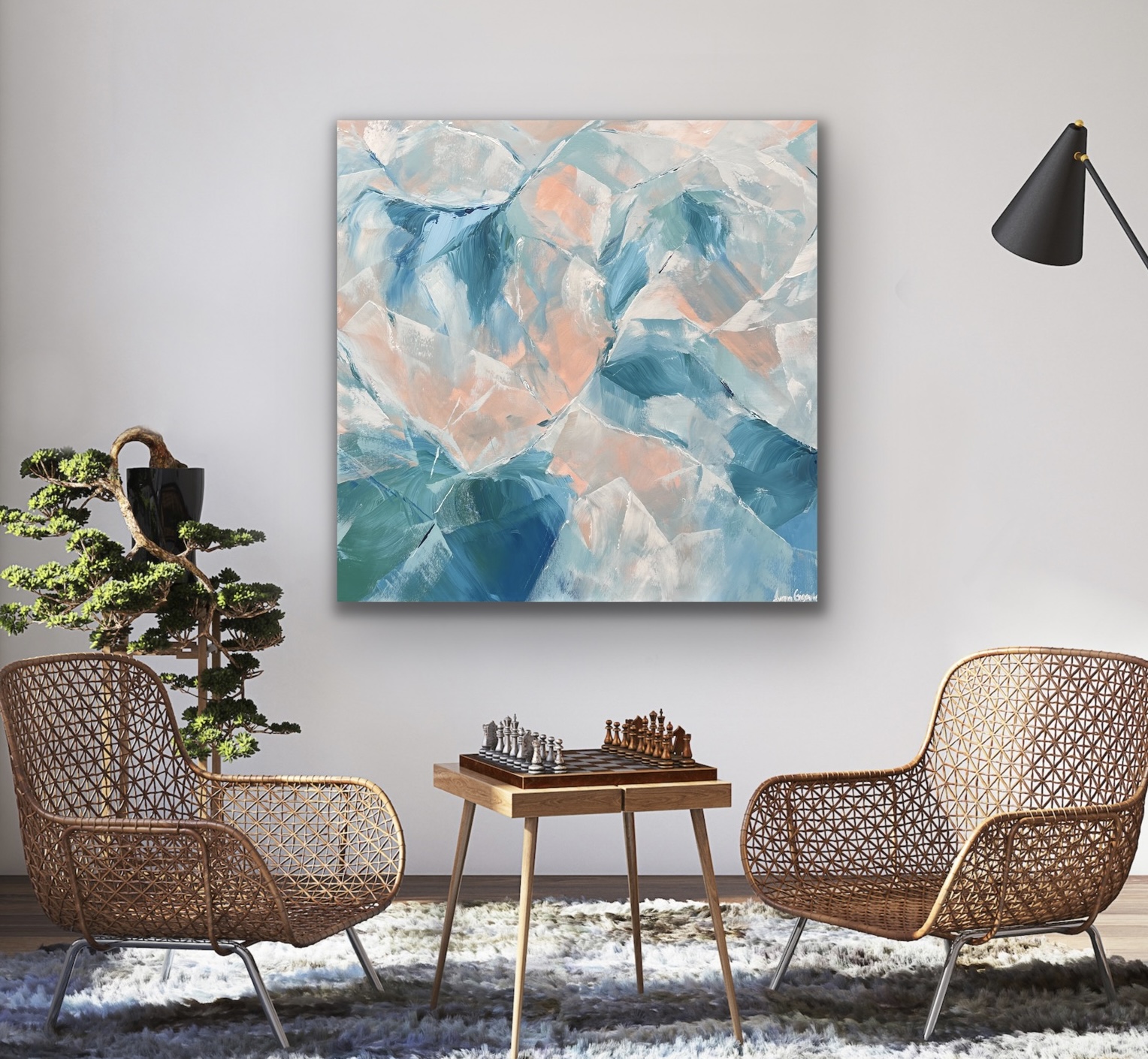 My latest addition to my ‘Daydreaming’ series features soft yet vibrant shades of coral, blue and green. A modern abstract artwork depicting the beginning of the Spring/Summer season. A lovely addition in any home.