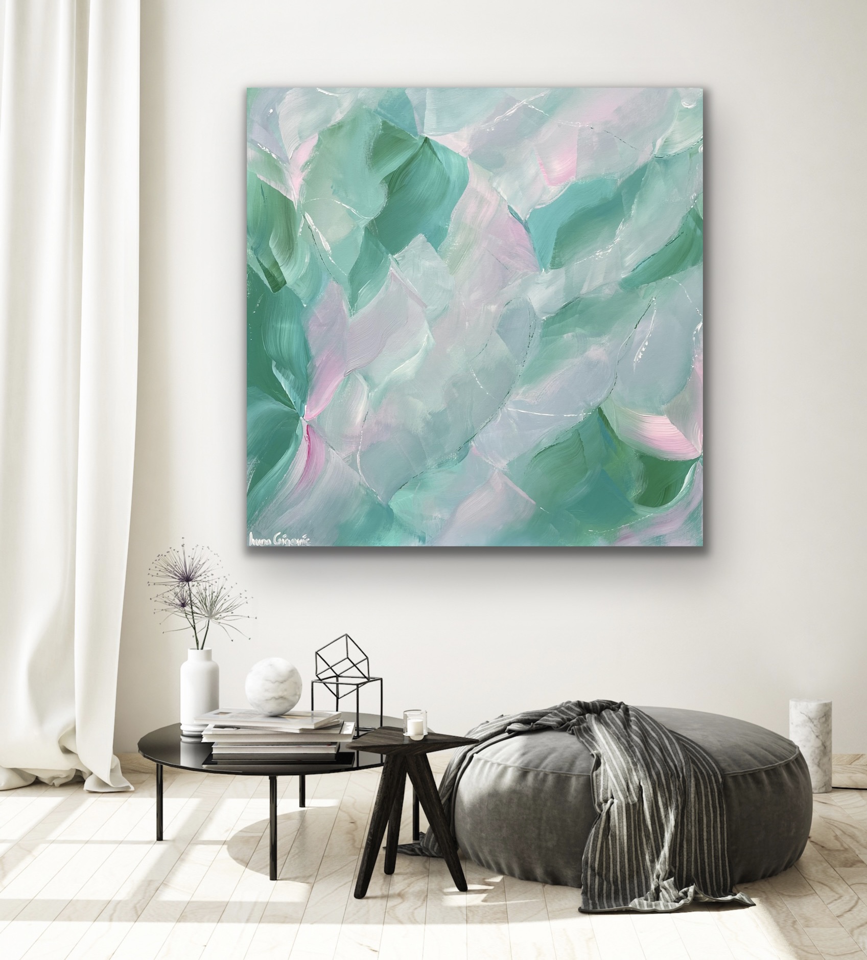 Vibrant teals and soft blues and greens highlight the fresh nature of the latest addition to my Daydreaming series. A touch of pink adds a dreamy touch. A lovely feature painting for any space.