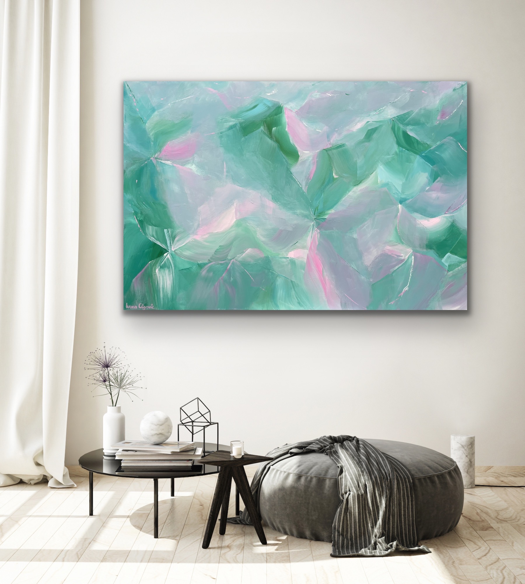 Vibrant teals and soft blues and greens highlight the fresh nature of the latest addition to my Daydreaming series. A touch of pink adds a dreamy touch. A lovely feature painting for any space.