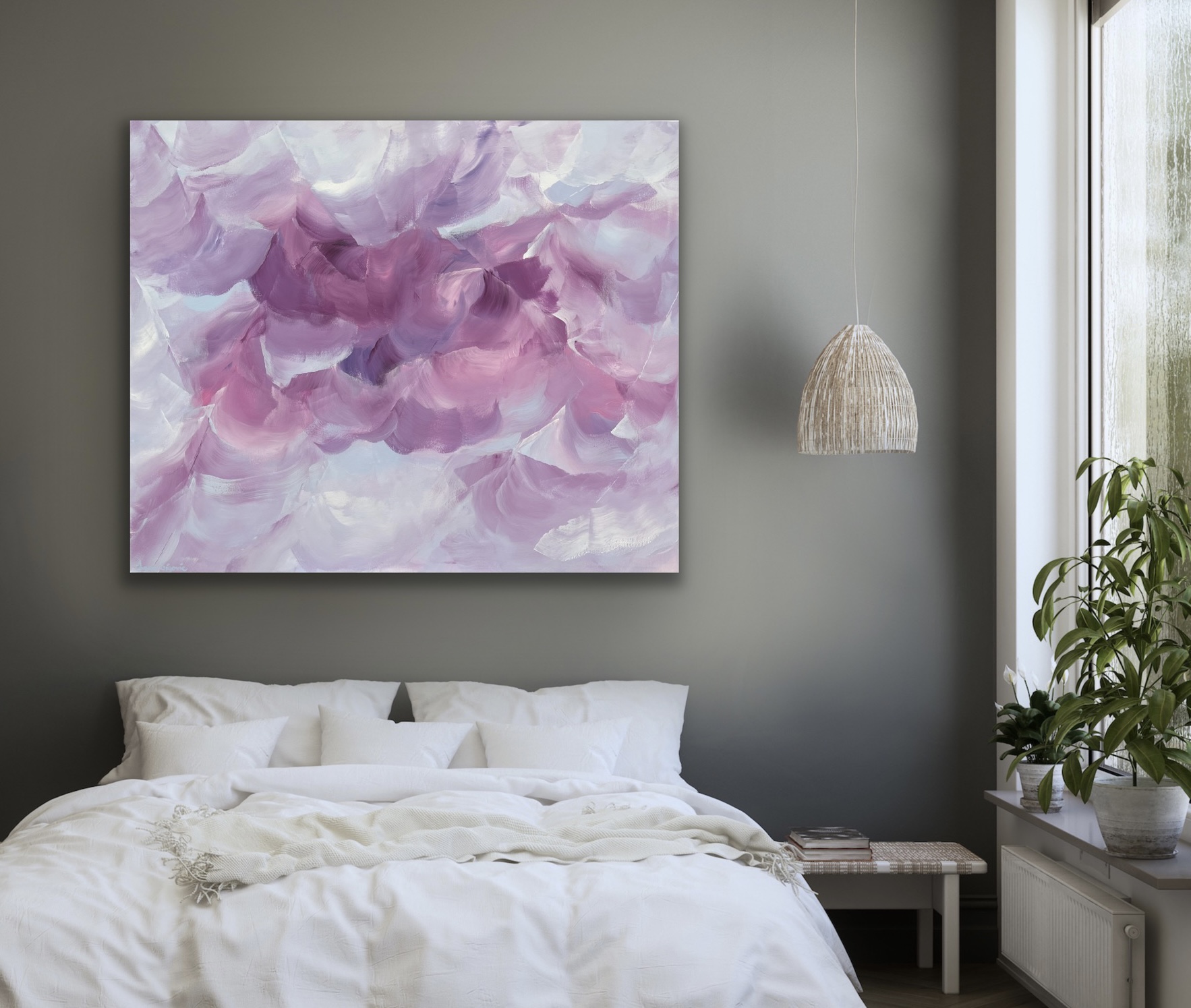 Vibrant purple tones highlight the deep nature of the latest addition to my ‘Daydreaming’ series. Soft blue tones add a calm touch to this abstract floral piece. . A wonderful feature painting in any space.