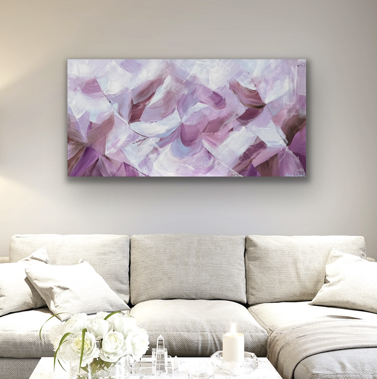 Vibrant purple tones are highlighted in the latest addition to my ‘Daydreaming’ series. Soft blue tones add a calm touch to this abstract piece. A vibrant and fresh feature painting in any space.