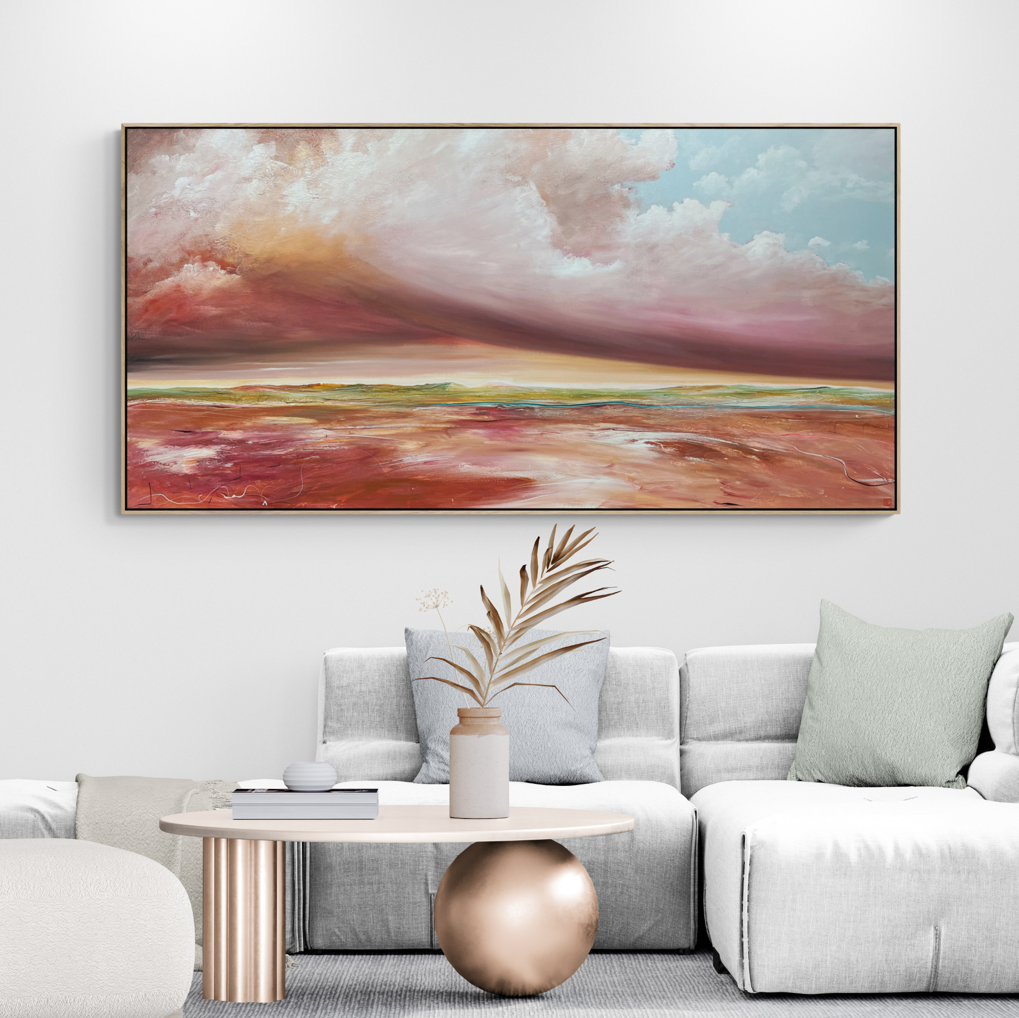 Tania is an Australian contemporary artist who has the desire to express emotion she feels from nature. Her feelings flow directly onto the canvas in an uninterrupted, intuitive flow; layers, textures and colours blend and evolve until some secret inner part feels satisfied. The depth and richness of the colours, the complexity of the sky – the romantic feeling of stormy clouds, the churning foam of the ocean on those days and the sunlight playing through tall grasses as they bend and wave. From the sweep of the vast landscape down to the bee among flowers, natures inspiration is endless.