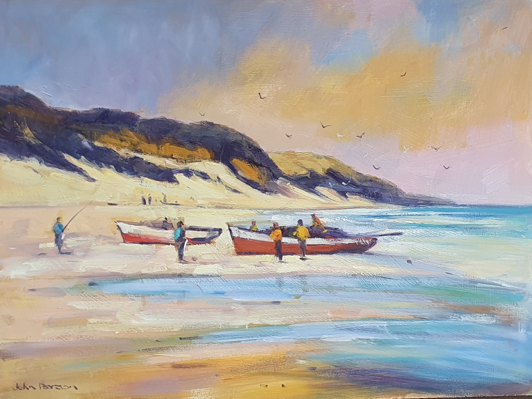 Day’s End by John Pearson – Fishing boats land on the beach after a day’s ocean fishing. They are exhausted and the late afternoon light warms the scene.
