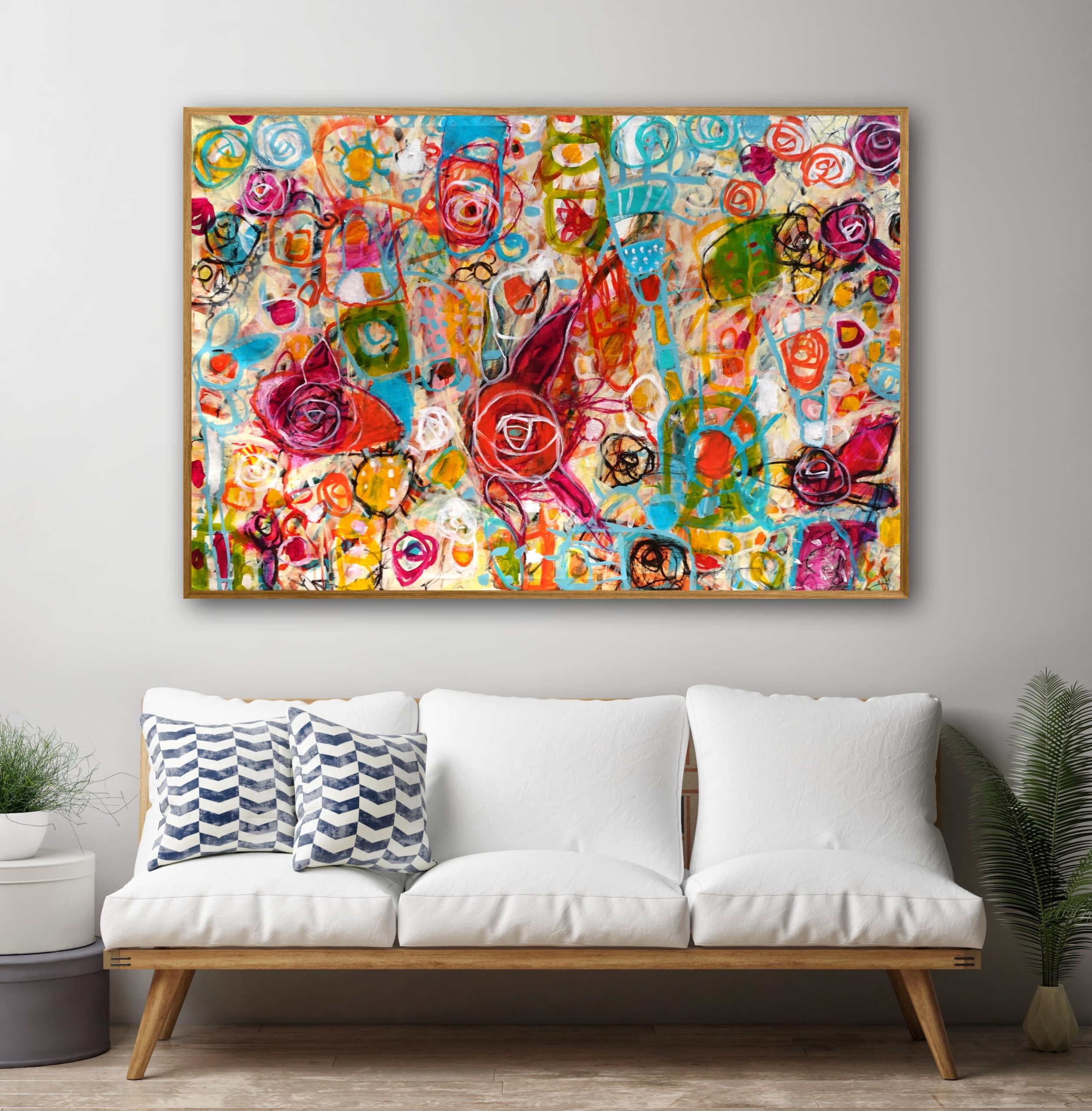 Artist Statement: I was thinking about days in the sun, in spring when the children are playing, we are yarning and its like there are roses floating in the breeze.