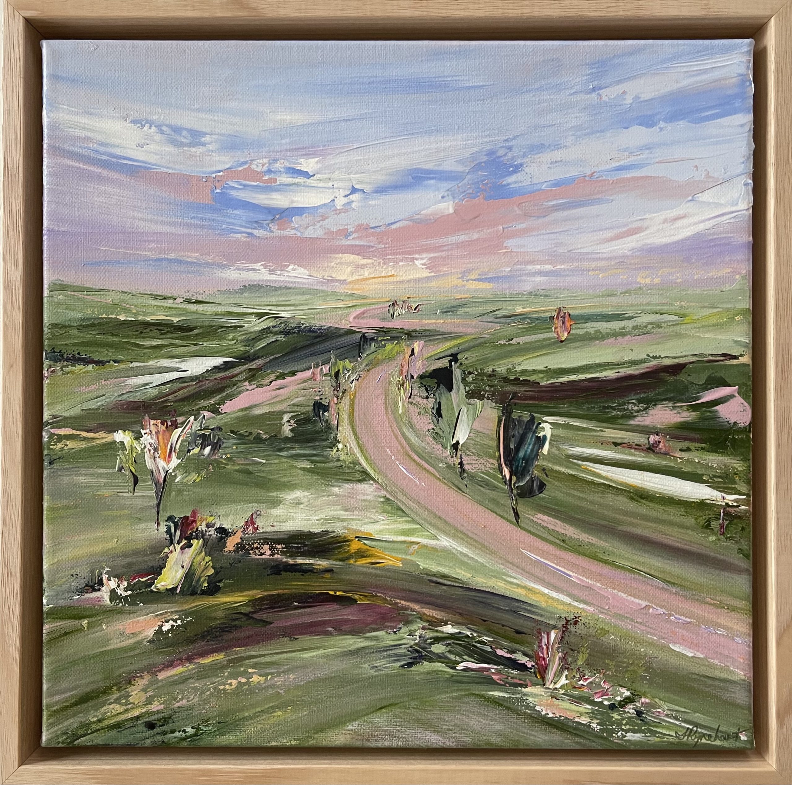 “Daytrip” is an expressive palette knife landscape inspired by the gorgeous scenery and winding roads between here and the coast that we frequently day trip to. Around every bend and turn there’s lush rolling hills, picturesque vistas and views, and usually, a stunning cloudscape to get lost in. I adore these trips in the car that fill me with hope, nudge me to appreciate the landscape around me, and anticipate happy days spent at the coast.