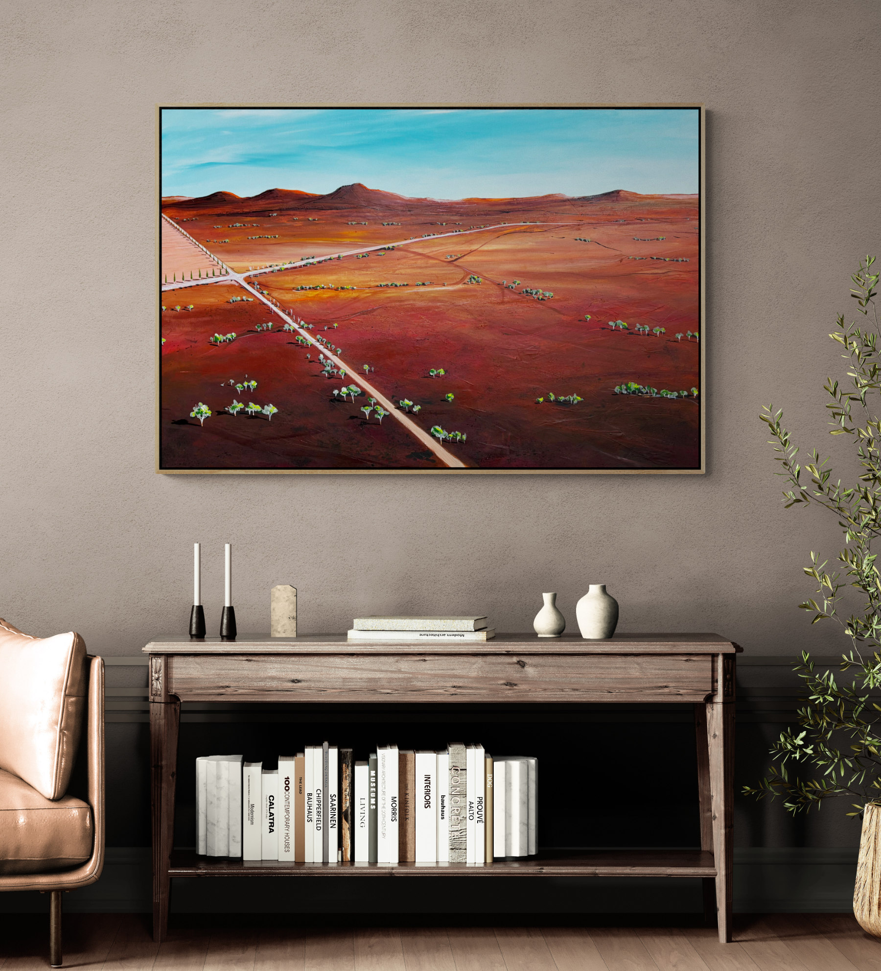 This painting captures the vast openness of the Australian outback, where endless red earth meets a clear blue sky. Two long, pale dirt roads intersect in the foreground, forming a striking cross that cuts through the landscape like a compass pointing to the horizon. Small clusters of green and white trees punctuate the scene, their scattered presence emphasising the scale and emptiness of the land. In the distance, low rust-coloured ranges rise gently against the skyline, their shapes softened by light. The piece balances precision in the geometry of the roads with the organic spread of vegetation, evoking themes of journey, choice, and the quiet beauty of remote places.