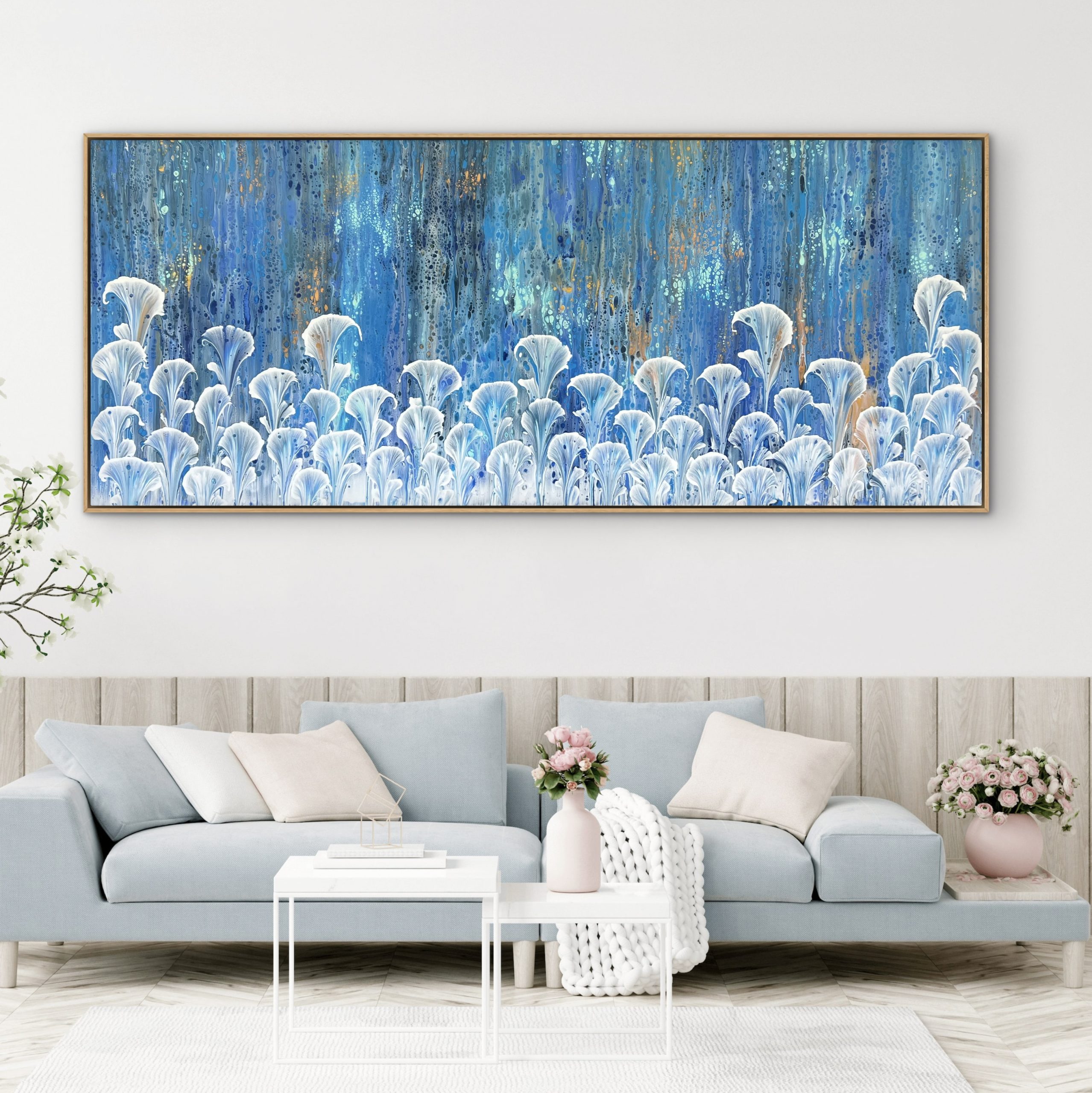 This HUGE gorgeous piece is 240cm x 100cm and features shades of blue, teal, turquoise, navy and white acrylics. This stunner is the latest addition to my range “Floral and Coral.” I will sign the bottom left corner before despatch.