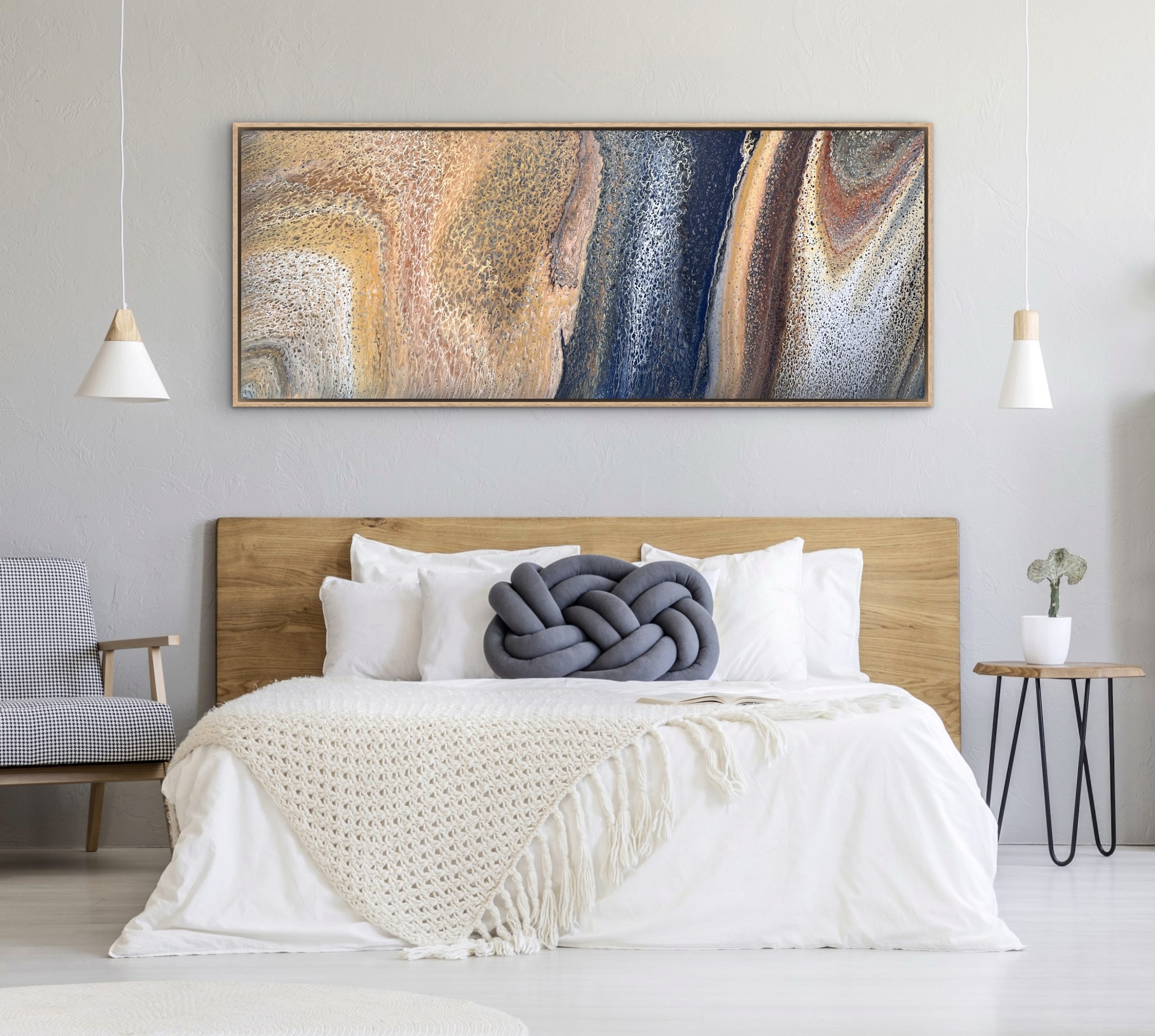 This gorgeous artwork was created using a combination of techniques that guide the pigments to flow, separate, and interact, forming intricate lace-like patterns and organic cells. Rich layers of ochre, sienna, rust, and warm sand flow alongside deep navy, indigo, and midnight blue, offset by areas of ivory, soft grey, and stone. Subtle touches of earthy terracotta and muted gold add balance and depth, while the natural movement creates a sense of shifting strata and mineral flow.