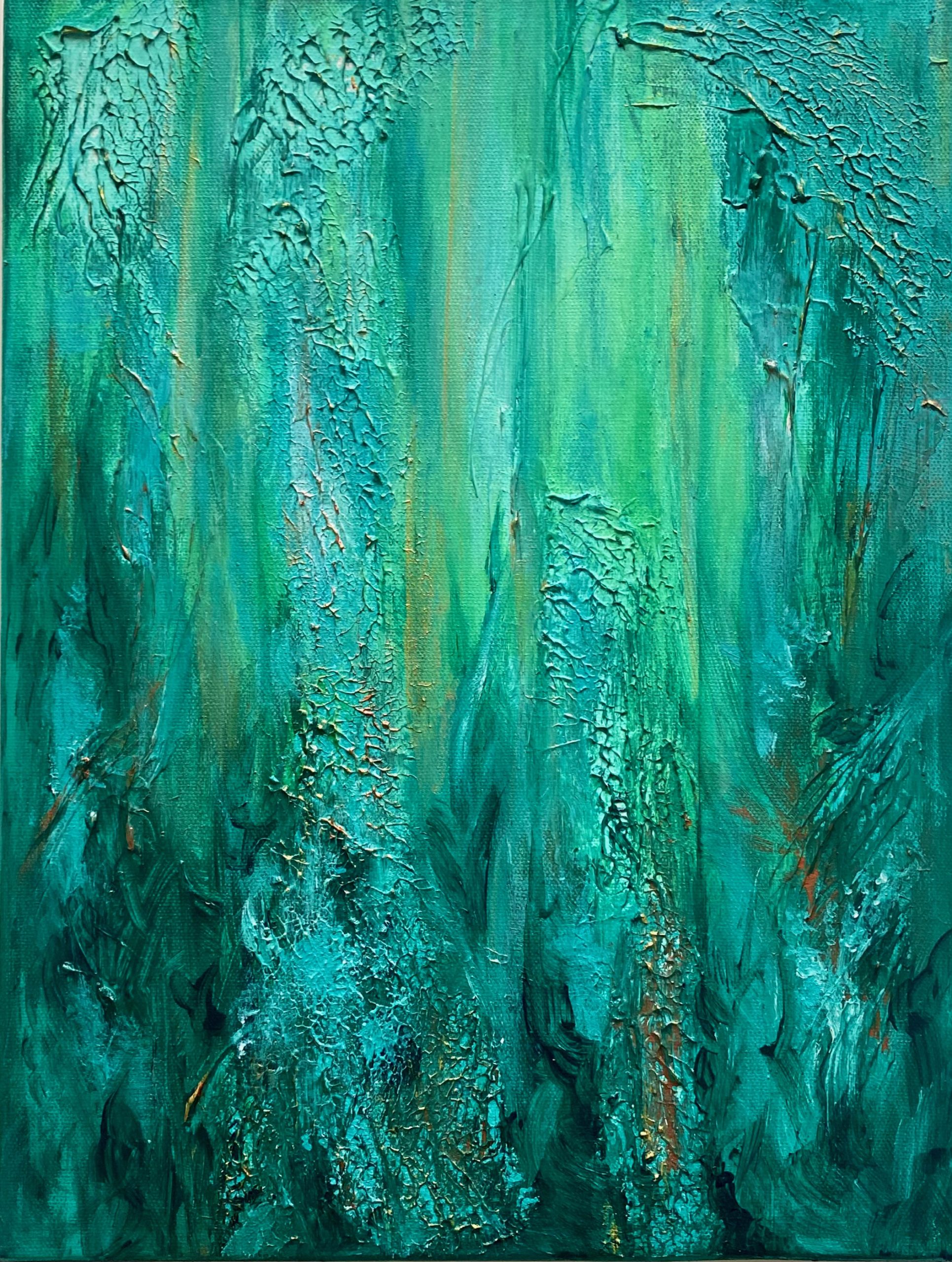 The painting was created using various techniques combined to allow increased flow, interaction and separation of colours to create interesting patterns where pops of colour can be seen emerging from underneath. This creates an added dimension which can’t be replicated. A gorgeous variety of acrylic pigments were used including shades of green, dark blue, burnt sienna and finished with gold highlights. Soft brush strokes of subtle copper metallic paint flow down through the painting in a glazed, impressionist style.