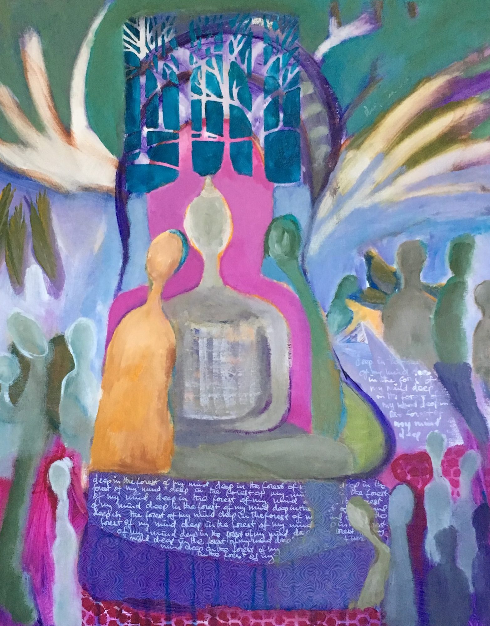 ‘Deep in the forest of my mind’ is influenced by my recent visit to Sri Lanka. I felt very overwhelmed by the overcrowded cities, people are turned into things who have to consume endlessly. Although there were many Buddhist temples the mindfulness and material detachment of the Buddhist philosophy I was looking for was hard to find. We are becoming a collective, changed by the system we often don’t want. This painting is about a feeling that human beings becoming part of a collective that is solitary although together.