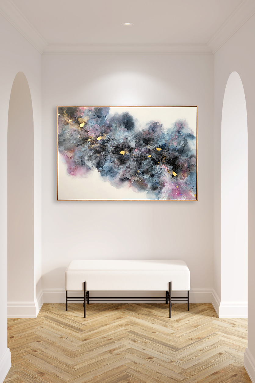 ‘Deep in the Silence’Â by Fern Siebler is an enchanting original artwork that radiates a blissfully serene atmosphere with its combination of blues, pink and luxurious gold tones. Let this piece bring a calming ambiance to your home, enjoy the tranquility and peace it provides to your surroundings.