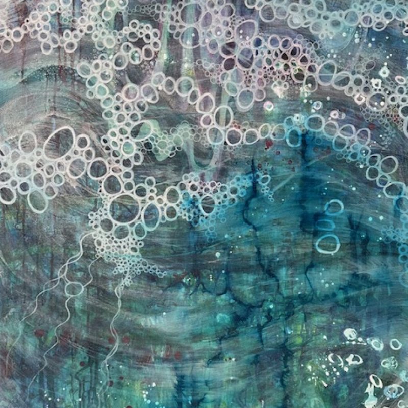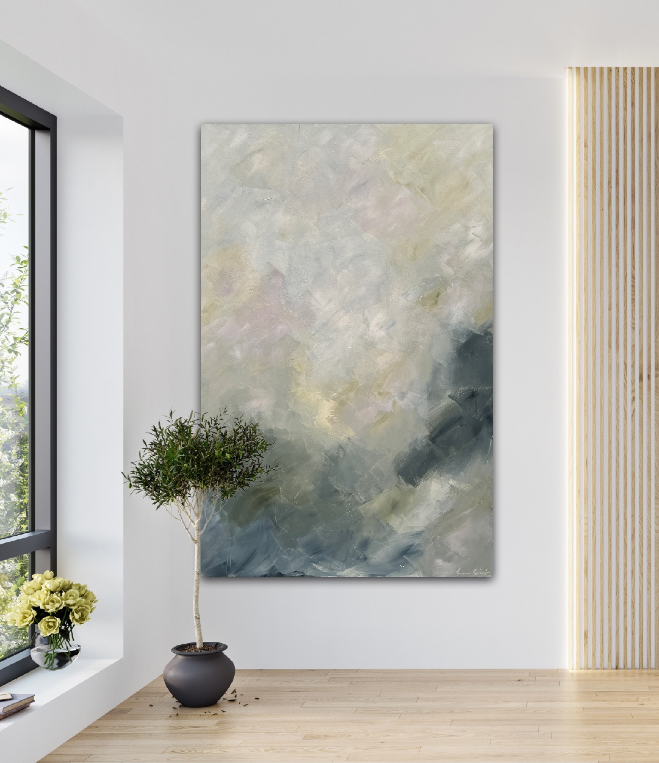This abstract piece weaves together deep navy, dark blue and green muted tones creating a moody, misty ambiance. I’ve utilised soft blending of these colours to evoke a feeling of a foggy landscape or light fading into the horizon.