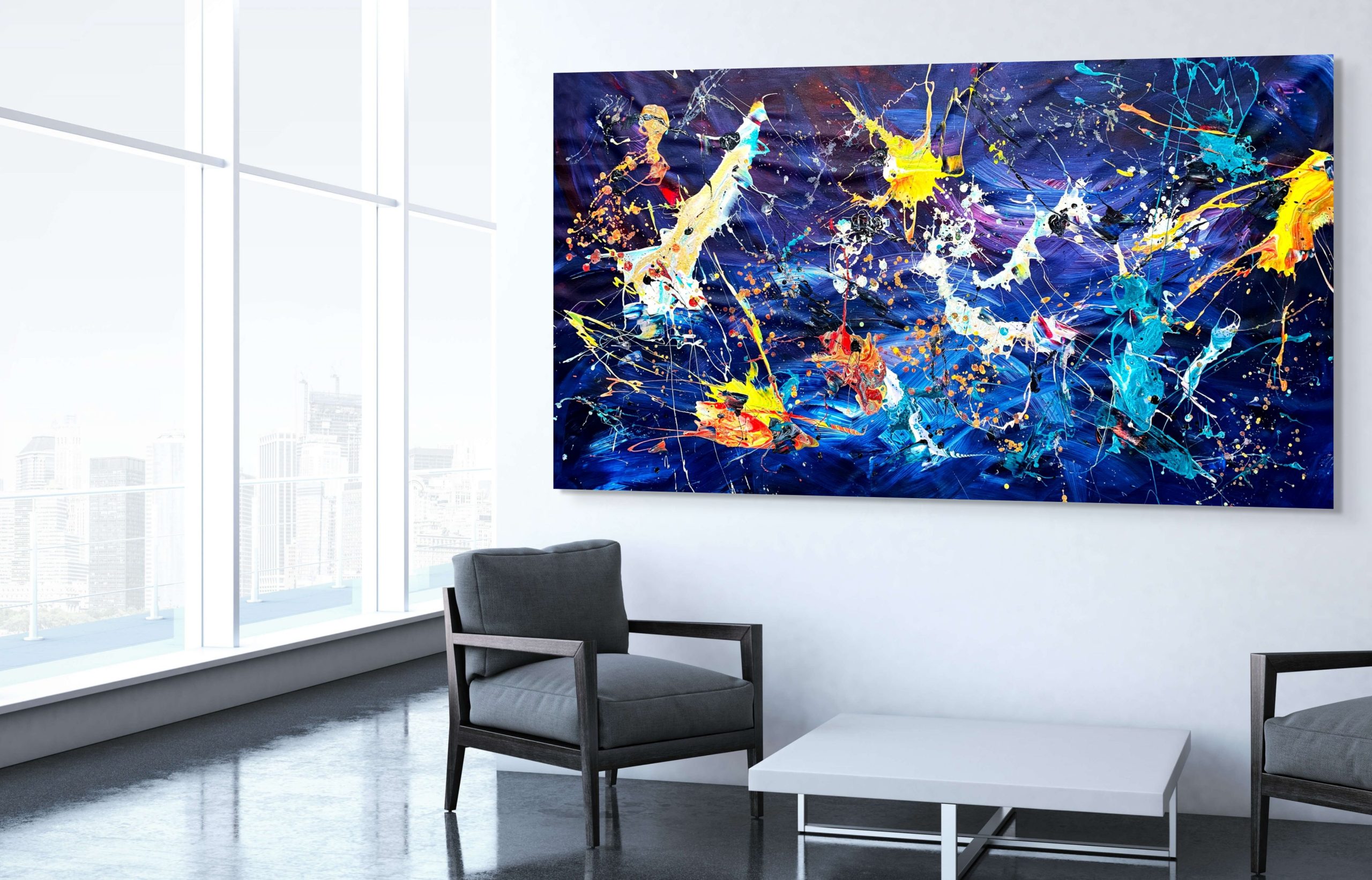This artwork is painted on professional-grade canvas stretched and sealed with varnish. The canvas has dimensions 198cm in width by 105 cm in height. The painting is painted on the sides in a different colour.