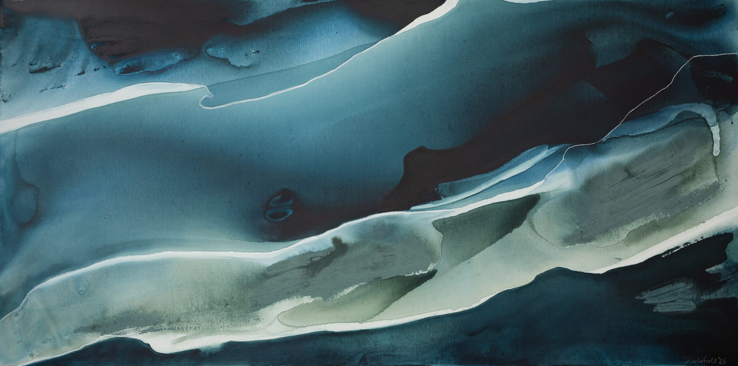 Deep Water Drift by Dinah Wakefield is inspired by the light, the colours and the natural beauty of the Noosa region of Australia. “What I love most about Noosa is the interplay of light. From the oceans to the clouds, to the river estuaries and the hinterland, this canvas unfolds before me every day and finds expression in my paintings”.