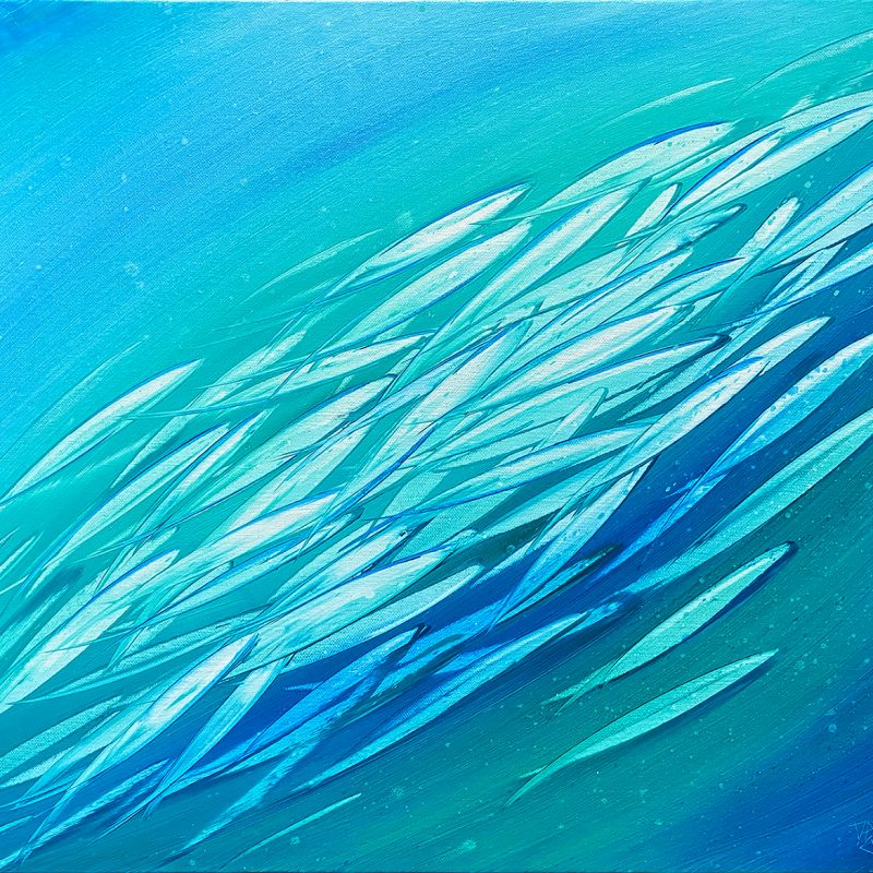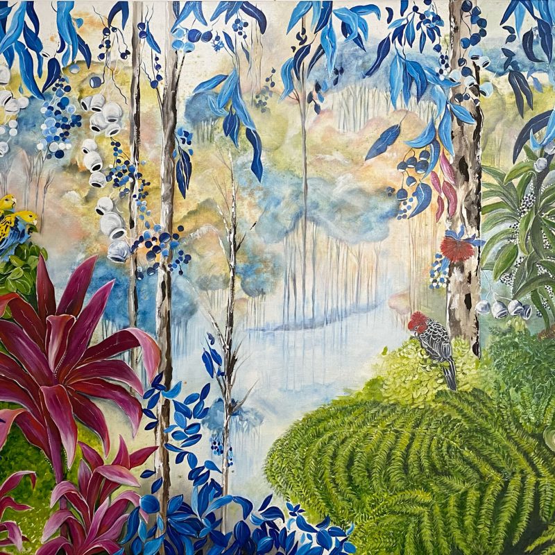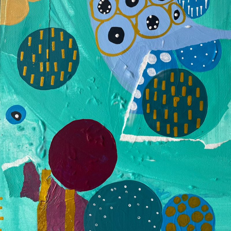 This intricately layered beauty bursts with the surprise of yellow wattle and purple eucalyptus blossoms, their shapes revealed through the magic of negative painting. Each crisp, lace-like silhouette dances over a tangle of rich texture, where countless layers of paint peek through in unexpected flashes. The colours hum against each other—sunny yellow popping like laughter beside velvety purple—while the surface itself feels alive with ridges, dips, and hidden details. It’s the kind of painting that pulls you in close, daring you to get lost in its joyful, bush-inspired maze.