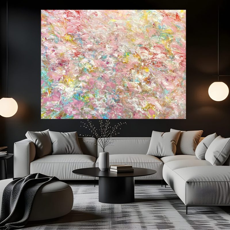 All edges Gallery-wrapped with the colours of the painting. Ready to hang with D-Rings and plastic-coated wire.
