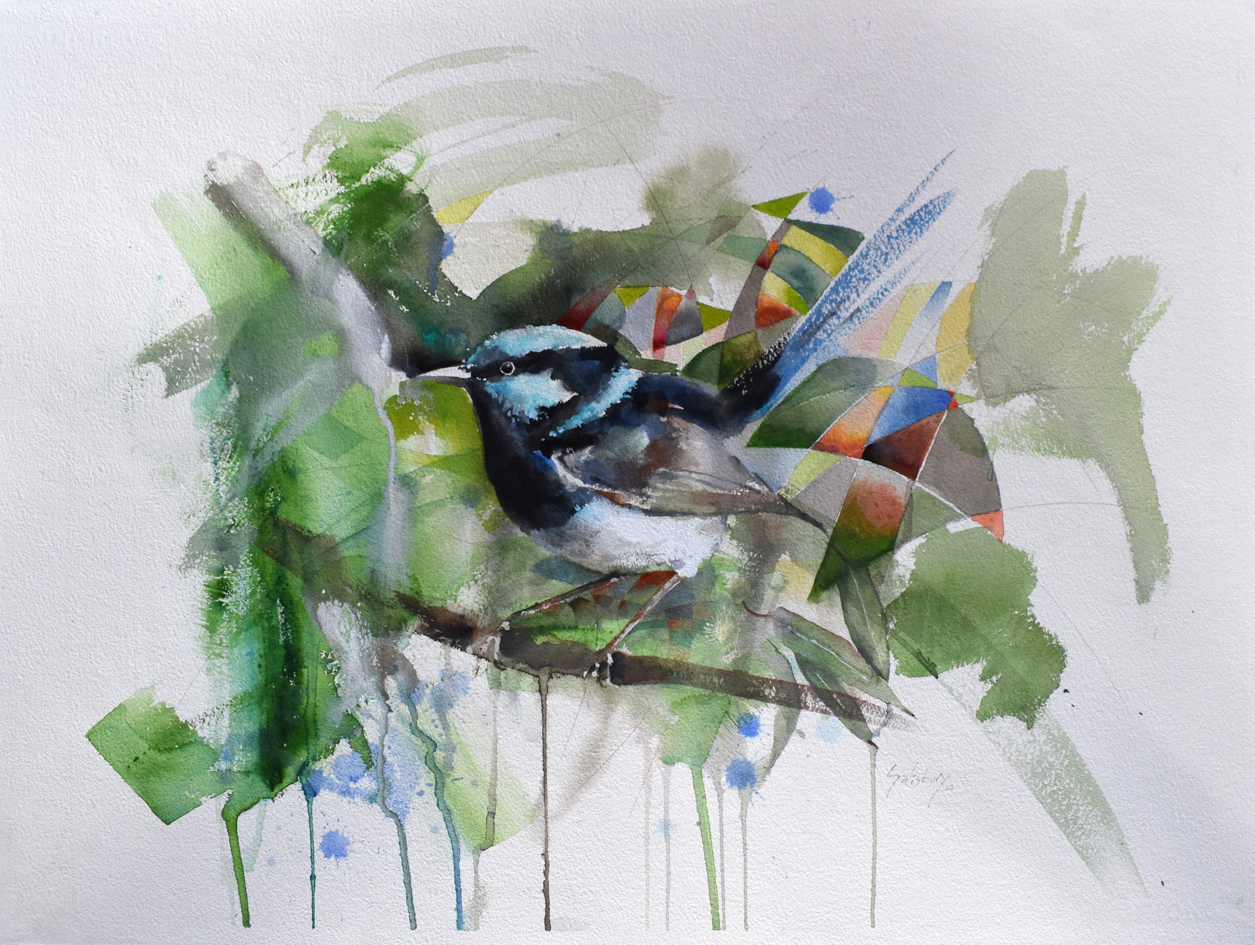 Delicately Poised by Trevor Salisbury – The superb Fairy Wren is one of my more favourite birds to paint. This expressive watercolour has traditional and oriental influences.