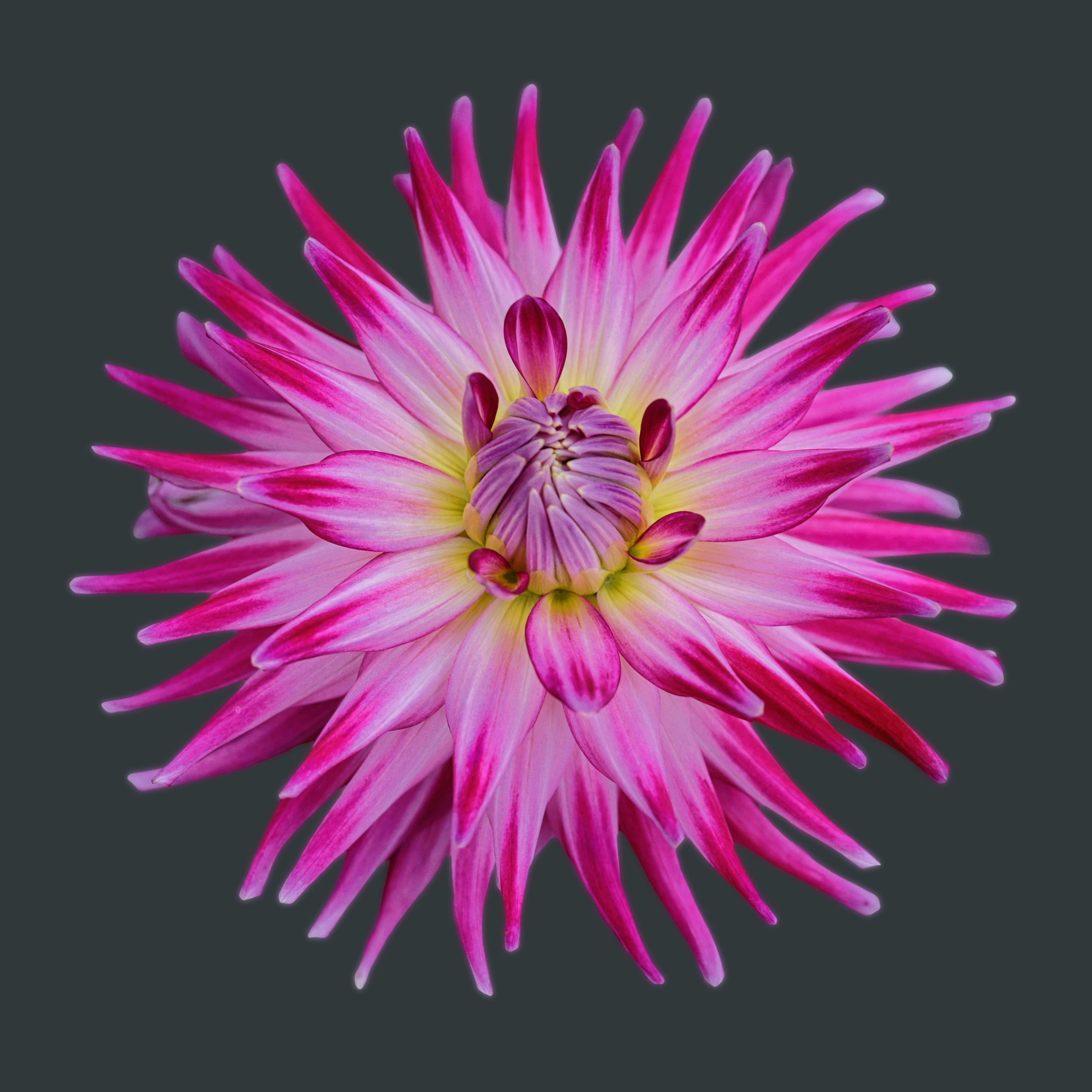 PLAYlogo mostly uses “straight from the camera” shots with at most minimal post-processing for optimal printing. This digitally edited image is an exception and with good cause, because this very special Dahlia photo deserved some special treatment. Background removal was performed lovingly using “manual digital” editing to feature the flower (and with more care and attention to form than so-called AI background removal can match). The image additionally employs a very subtle background layering technique that blends the petal edges into the background, so that when viewed mounted on Acrylic Float Frame it appears to have a very subtle “glow” around the flower petals. The result is a slightly cartoony look that works brilliantly with the Dahlia form.