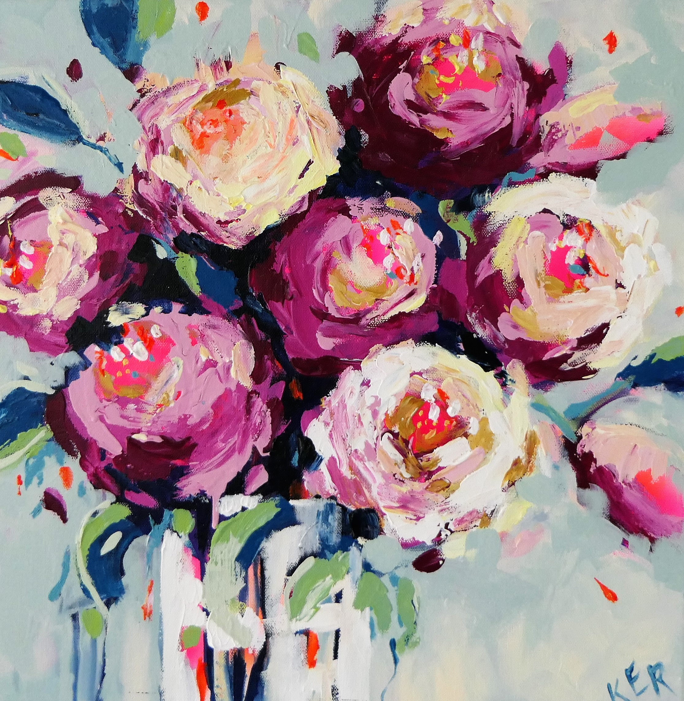 The inspiration for this painting came from the roses in my own garden, plentiful and in full bloom. I wanted to create a vibrant coloured painting that still depicted the abundant, full body and structure of the roses. The roses are in a clear container.