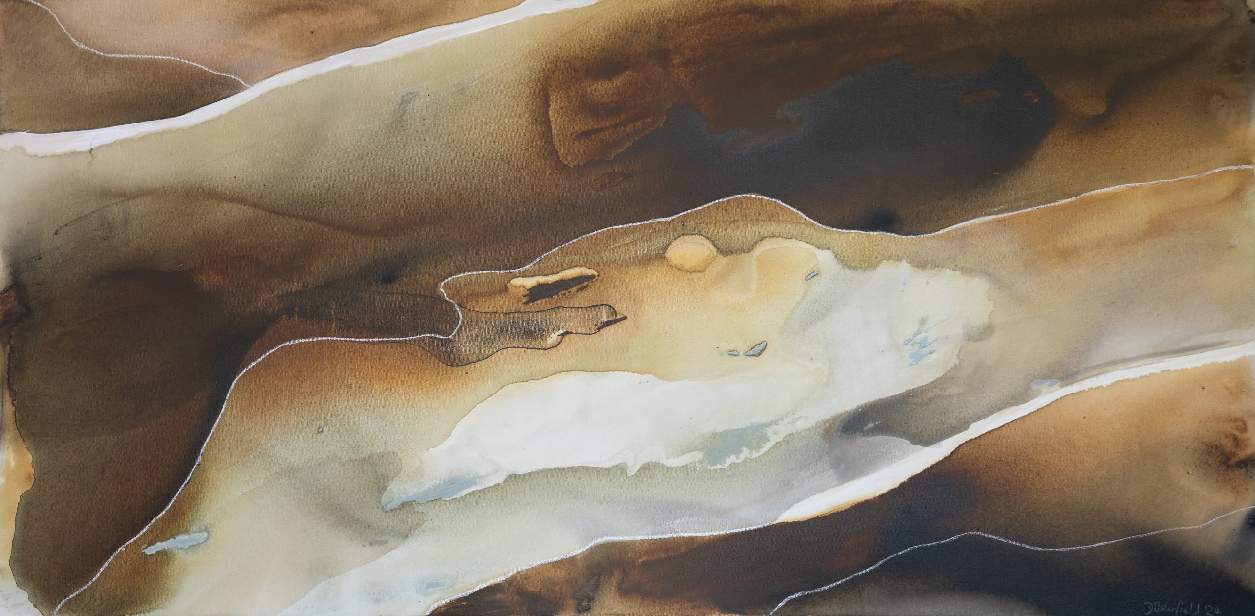Desert Crossing by Dinah Wakefield is inspired by the light, the colours and the natural beauty of the Noosa region of Australia. “What I love most about Noosa is the interplay of light. From the oceans to the clouds, to the river estuaries and the hinterland, this canvas unfolds before me every day and finds expression in my paintings”.