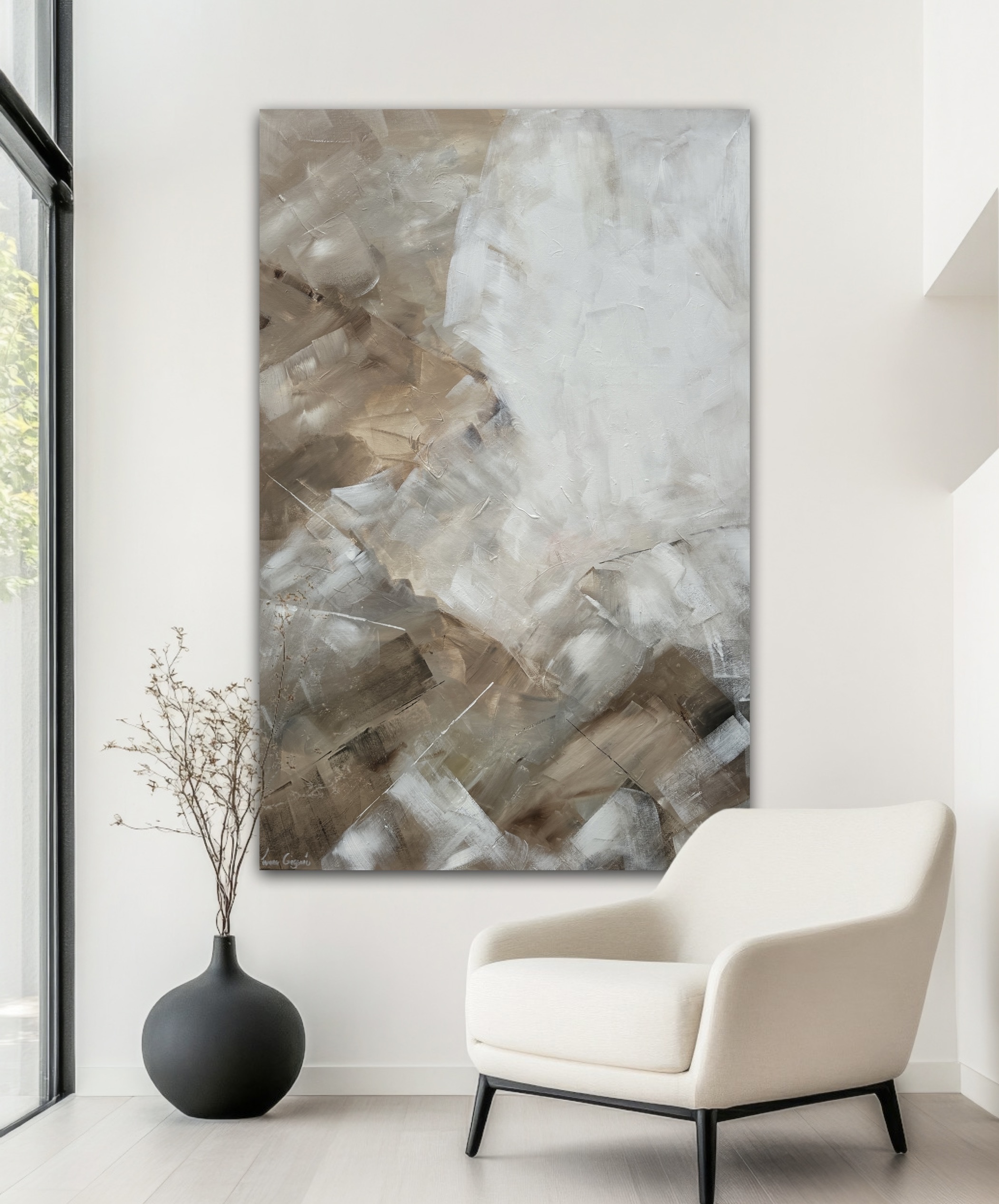 This artwork has a calming and earthy feel with soft neutral tones blending into one another in a textured abstract style. These tones create a peaceful and sophisticated ambiance.