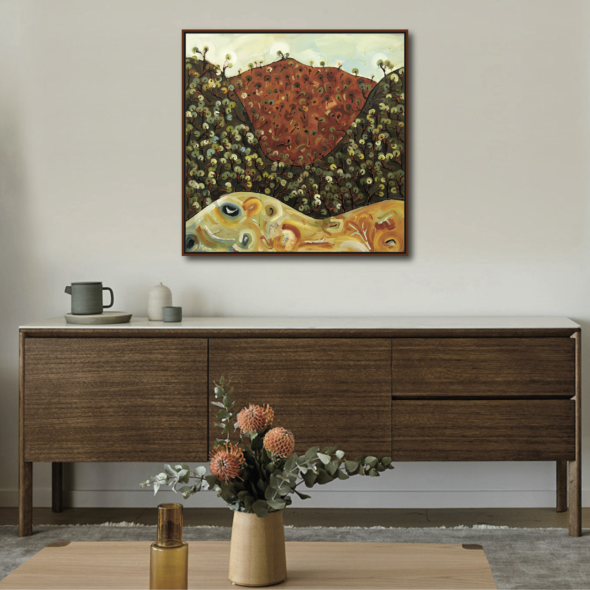 Desert Love Song 3 by Michael Wolfe – 85x85cm framed in a thin line Mountain Ash frame in a Walnut stain and natural Danish Oil finish.
