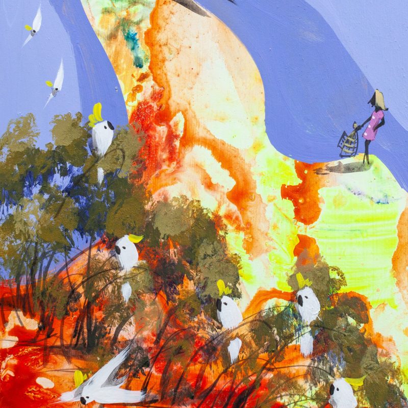 This colourful abstract landscape is inspired by the rhythms and forms of Australia’s varied desert country – rocky outcrops, dramatic trees, earthy colours. I continue to explore this theme in my practice, reaching deep into memories and impressions of my travels.