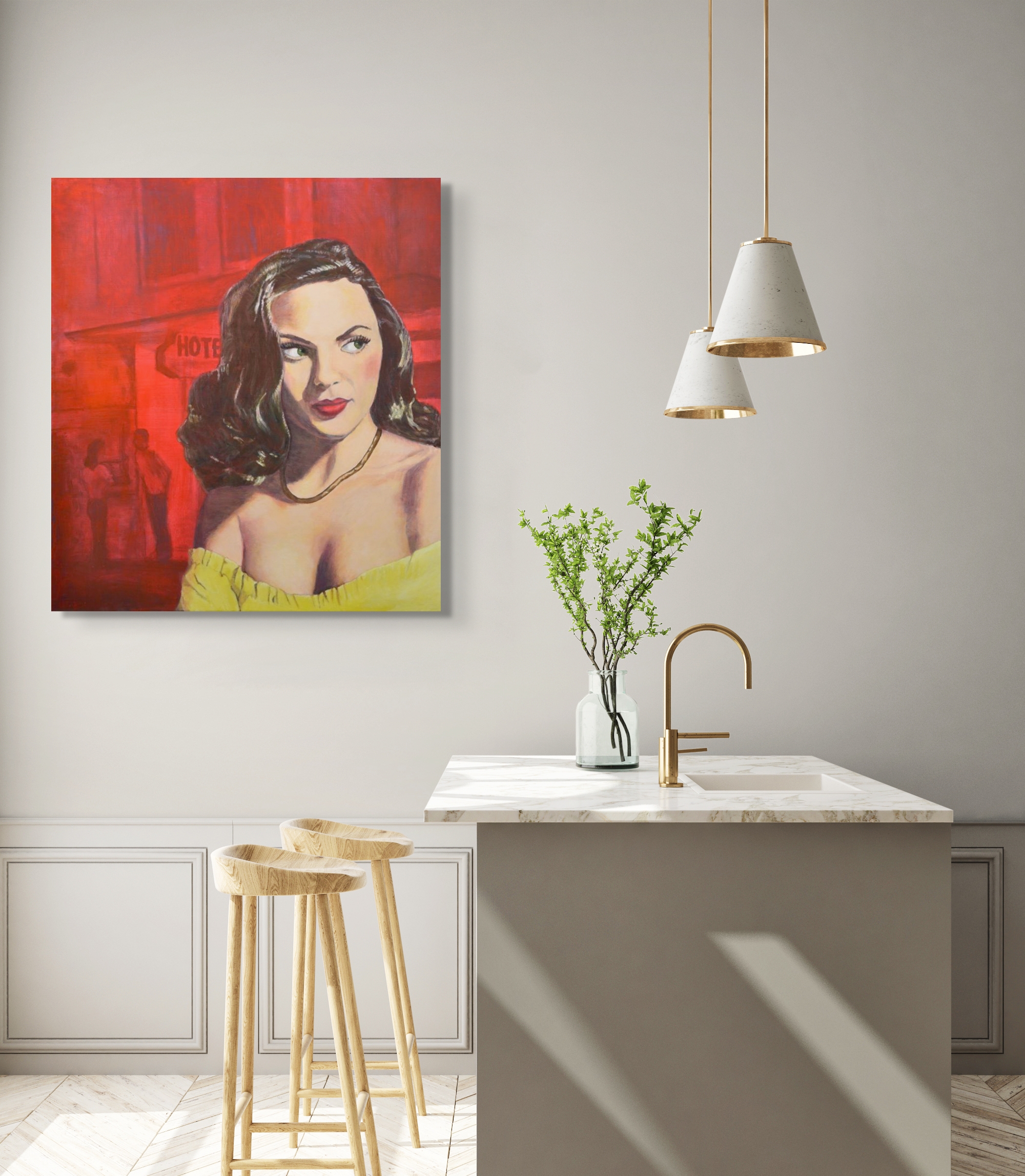 Jane’s painting Desperado shows a woman downtown on a Saturday night. With its garish red background and the woman’s sultry appearance the painting hints at prostitution – and although the woman is smiling seductively, her gaze out of the picture frame implies that she wants to escape. Hence the title Desperado – which means a desperate woman in Spanish. Despite these hints at prostitution, the viewer is left unsure whether it is simply a painting of a young carefree girl out seeking a good time on Saturday night. To create her painting Jane appropriated a photo from a 1950s pulp detective magazine. This acrylic painting on canvas is ready to hang and has beautiful acrylic colors and a gloss varnish finish. The main colors in this wall art are red and lime green.