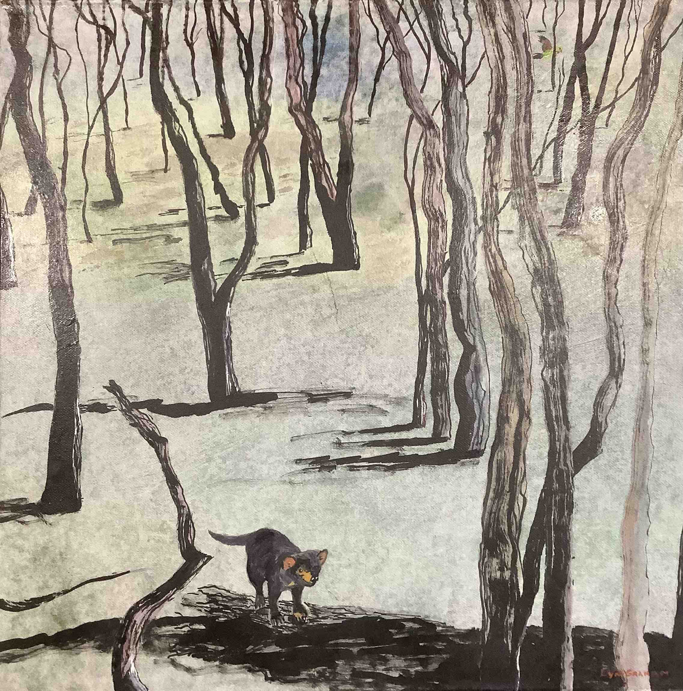 This painting is part of All Creatures, a small experimental series focussing on the endangered and extinct marsupials and birds of Tasmania.