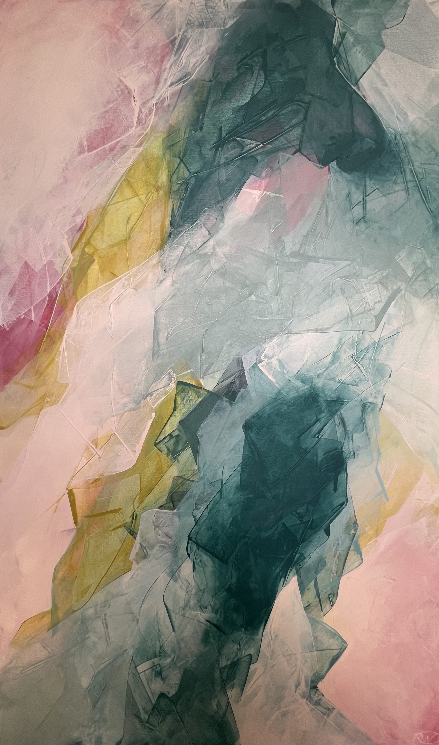 This is a painting where layers have been built up with the use of a Catalyst Wedge. Subdued pastel hues have been juxtaposed with yellow oxide, pink and dark emerald to create a sense of contrast. Aesthetic appeal has been achieved in the sense of movement and folded texture.