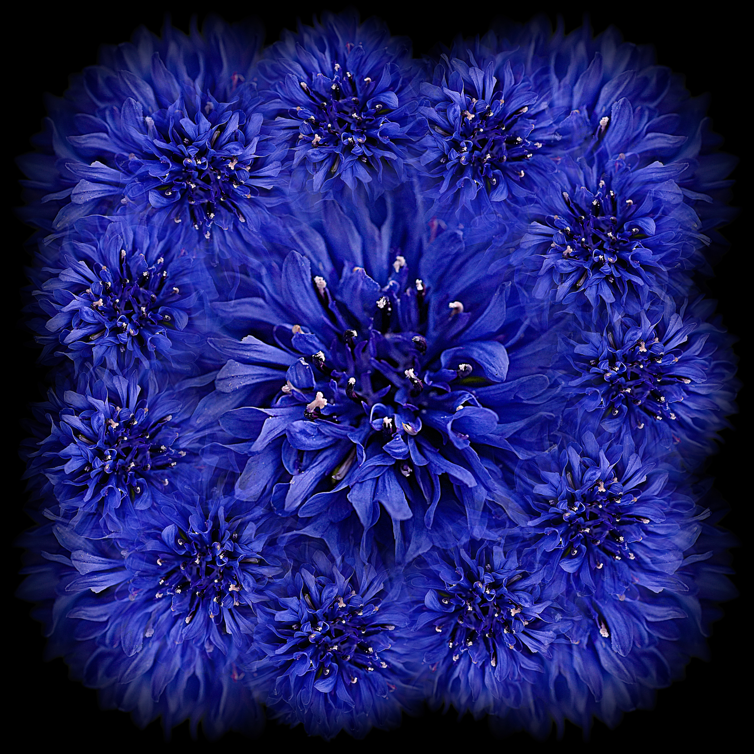‘DigiFlower No 6 – Indigo Bluecap Blues by PLAYlogo  from his ‘DigiFlower’ series. A digital composition based on a high resolution macro photo of an indigo Blue Cap flower (aka Cornflower or Bachelor’s button). Combines 11-fold symmetry with parametric geometry and visual FX techniques.