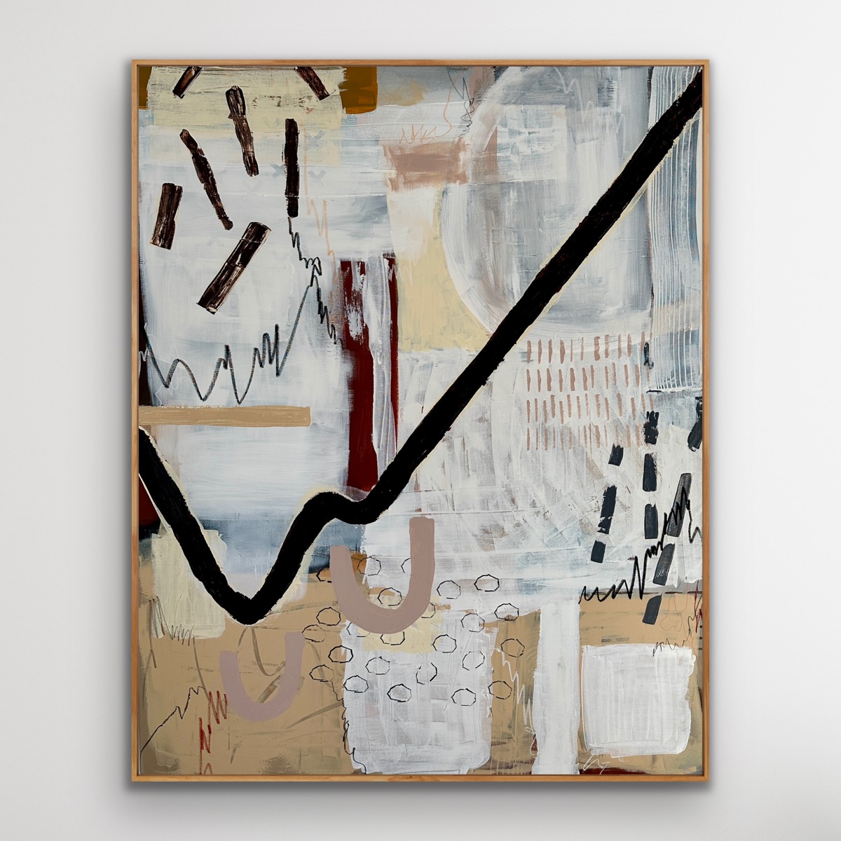 Building Bridges by Stefana Kachirski – a modern abstract piece that will bring life and inspiration into a space. The abstract shapes and lines come together to create a piece of art. This artwork is an original artwork on quality canvas- framed in Tasmanian Oak and ready to hang.