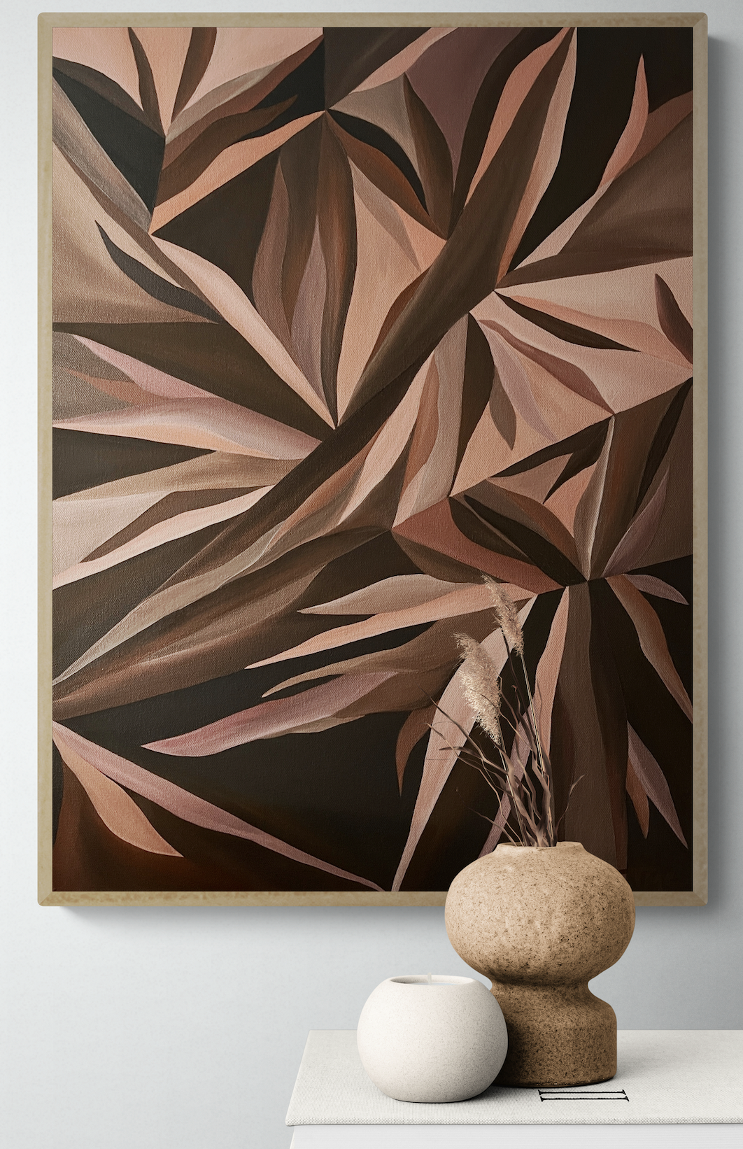 Directional Perspectives by Tara Cunniffe – Geometric oil on canvas painting with hues of soft pink, brown and mauve. Birds of paradise flower ideology painted in geometric euphoric scenes of landscapes with three dimensional triangular angles incorporated with intense tonal brushstrokes. Exploring the many layers and depths of identity, life cycles and experiences through geometry and hidden interpretations. There are connecting points from all angles and each triangular prism signifies a projection of journeys within the subconscious mind. Evoking sense of being in a trance, portraying a myriad of motions, unsure of what path to take – navigating ones true identity through the hurdles life throws. Analysing who you truly are and finding the beauty within.